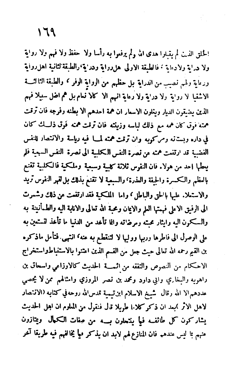 الخلق الذين لم يقبلوا هدى الله ولم يرفعوا به رأساً ولا حفظ ولا فهم ولا رواية ولا دراية ولا رعاية، فالطبقة الأولى أهل رواية ودراية، والطبقة الثانية أهل رواية وعاية ولهم نصب من الدراية بل حظهم من الرواية أوفر، والطبقة الثالثة الأشقياء لا رواية ولا دراية ولا رعاية إن هم إلا كالأنعام بل هم أضل سبيلاً وهم الذين يضيقون الديار ويغلون الأسعار إن همة أحدهم إلا بطنه وفرجه فإن ترقت همته فوق كان همه مع ذلك لباسه وزينته فإن ترقت همته فوق ذلك كان في داره وبستانه ومركوبه وإن ترقت همته لما فيه رياسة والانتصار للنفس الغضبية قد ارتفعت همته عن نصرة النفس الكلبية إلى نصرة النفس السبعية فلم يعطها أحد من هؤلاء فإن النفوس ثلاثة كلبية وسبعية وملكية فالكلبية تقنع بالعظم والكسرة والجيفة والعذرة، والسبعية لا تقنع بذلك، بل لقهر النفوس تريد الاستعلاء عليها بالحق والباطل، وأما الملكية فقد ارتفعت عن ذلك وشمرت إلى الرفيق الأعلى فهمتها العلم والإيمان ومحبة الله تعالى والإنابة إليه والطمأنينة به والسكون إليه وإيثار محبته ومرضاته وإنما تأخذ من الدنيا ما تأخذ لتستعين به على الوصول إلى فاطرها وربها ووليها لا لتنقطع به عنه. انتهى. فتأمل ما ذكره ابن القيم –رحمه الله تعالى- حيث جعل من القسم الذين اعتنوا بالاستنباط واستخراج الأحكام من النصوص والتفقه من أئمة الحديث كالأوزاعي وإسحاق بن راهوية والبخاري وأبي داود ومحمد بن نصر المروزي وأمثالهم ممن لا يحصي عددهم إلا الله وقال شيخ الإسلام ابن تيمية قدس الله روحه في كتابه "الانتصار لأهل الأثر" بعد أن ذكر كلاماً طويلاً قال: فنقول من المعلوم أن أهل الحديث يشاركون كل طائفة فيما ينتحلون به من صفات الكمال ويمتازون عنهم بما ليس عندهم فإن المنازع لهم لا بد أن يذكر فيما يخالفهم فيه طريقاً آخر