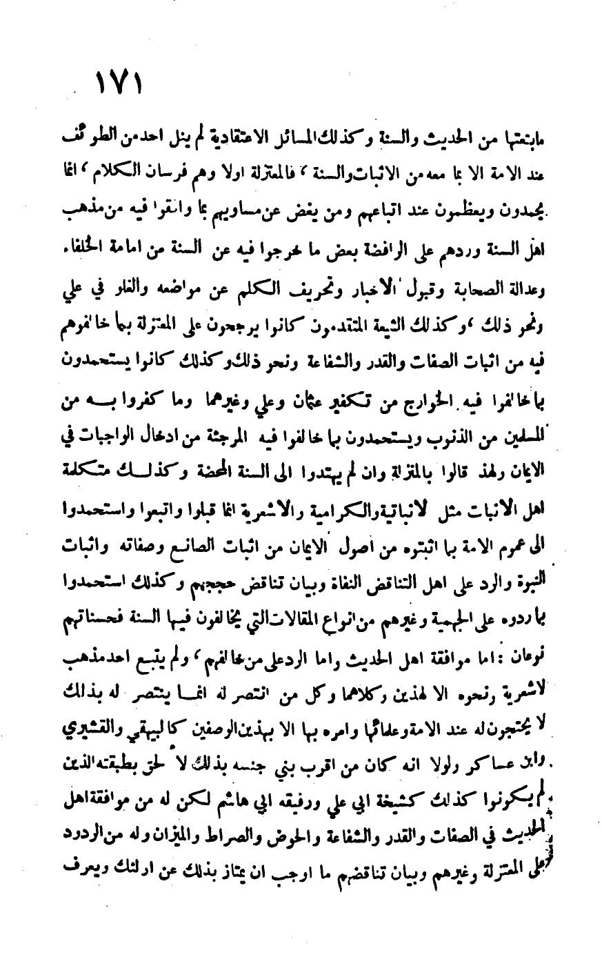 ما بتعتها من الحديث والسنة وكذلك المسائل الاعتقادية لم ينل أحد من الطوائف عند الأمة إلا بما معه من الإثبات والسنة، فالمعتزلة أولا هم فرسان الكلام، إنما يحمدون ويعظمون عند إتباعهم ومن يغض عن مساويهم بما والقوا فيه من مذهب أهل السنة وردهم على الرافضة بعض ما خرجوا فيه عن السنة من إمامة الخلفاء وعدالة الصحابة وقبول الأخبار وتحريف الكلم عن مواضعه والغلو في علي ونحو ذلك، وكذلك الشيعة المتقدمون كانوا يرجحون على المعتزلة بما خالفوهم فيه من إثبات الصفات والقدر والشفاعة ونحو ذلك وكذلك كانوا يستحمدون بما خالفوا فيه الخوارج من تكفير عثمان وعلي وغيرهما وما كفروا به من المسلمين من الذنوب ويستحمدون بما خالفوا فيه المرجئة من إدخال الواجبات في الإيمان ولهذا قالوا بالمنزلة وإن لم يهتدوا إلى السنة المحضة وكذلك متكلمة أهل الإثبات مثل الانباتية والكرامية والأشعرية إنما قبلوا واتبعوا واستحمدوا إلى عموم الأمة بما أثبتوه من أصول الإيمان من إثبات الصانع وصفاته وإثبات النبوة والرد على أهل التناقض النفاة وبيان تناقض حججهم وكذلك استحمدوا بما ردوه على الجهمية وغيرهم من أنواع المقالات التي يخالفون فيها السنة فحسناتهم نوعان: إما موافقة أهل الحديث وإما الرد على مخالفهم، ولم يتبع أحد مذهب الأشعرية ونحوه غلا لهذين وكلاهما وكل من انتصر له إنما ينتصر له بذلك لا يحتجون له عند الأمة وعلمائها وأمره بها إلا بهذين الوصفين كالبيهقي والقشيري وابن عساكر ولولا أنه كان من أقرب بني جنسه بذلك لألحق بطبقته الذين لم يكونوا كذلك كشيخة أبي علي ورفيقه أبي هاشم لكن له من موافقة أهل الحديث في الصفات والقدر والشفاعة والحوض والصراط والميزان وله من الردود على المعتزلة وغيرهم وبيان تناقضهم ما أوجب أن يمتاز بذلك عن أولئك ويعرف