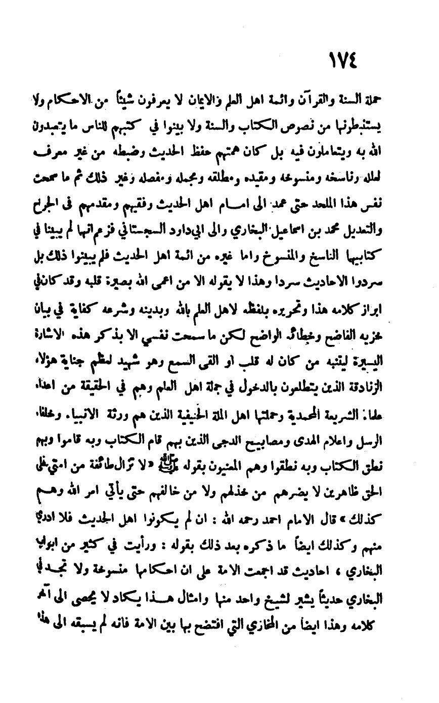 حملة السنة والقرآن وأئمة أهل العلم والإيمان لا يعرفون شيئاً من الأحكام وما يستنبطونه من نصوص الكتاب السنة ولا بينوا في كتبهم للناس ما يتعبدون الله به ويتعاملون فيه بل كان همتهم حفظ الحديث وضبطه من غير معرفة لعلله وناسخه ومنسوخه ومقيده ومطلقه ومجمله ومفصله وغير ذلك ثم ما سمحت نفس هذا الملحد حتى عمد إلى إمام أهل الحديث وفقيههم ومقدمهم في الجرح والتعديل محمد بن إسماعيل البخاري وإلى أبي داود السجستاني فزعم أنهم لم يبينا في كتابهما الناسخ والمنسوخ وأما غيره من أئمة أهل الحديث فلم يبينوا ذلك بل سردوا الحديث سرداً وهذا لا يقوله إلا من أعمى الله بصيرة قلبه وقد كان في إبراز كلامه هذا وتحريره بلفظه لأهل العلم بالله وبدينه وشرعه كفاية في بيان خزيه الفاضح وخطئه الواضح لكن ما سمحت نفسي إلا بذكر هذه الإشارة اليسيرة ليتنبه من كان له قلب أو ألقى السمع وهو شهيد معظم جناية هؤلاء الزنادقة الذين يتطلعون بالدخول في جملة أهل العلم وهم في الحقيقة من أعداء علماء الشريعة المحمدية وحملتها أهل الملة الحنيفية الذين هم ورثة الأنبياء وخلفاء الرسل وأعلام الهدى ومصابيح الدجى الذين بهم قام الكتاب وبه قاموا وبهم نطق الكتاب وبه نطقوا وهم المعنيون بقوله –صلى الله عليه وسلم-: "لا تزال طائفة من أمتي على الحق ظاهرين لا يضرهم من خذلهم ولا من خالفهم حتى يأتي أمر الله وهم كذلك" قال الإمام أحمد –رحمه الله- إن لم يكونوا أهل الحديث فلا أدري منهم وكذلك أيضاً ما ذكره بعد ذلك بقوله ورأيت في كثير من أبواب البخاري أحاديث قد أجمعت الأمة على أن الحكم بها منسوخة ولا تجد في البخاري حديثاً يشير الشيخ واحد منها وأمثال يكاد لا يحصى إلى آخر كلامه وهذا أيضاً من المخازي التي؟ وهذه