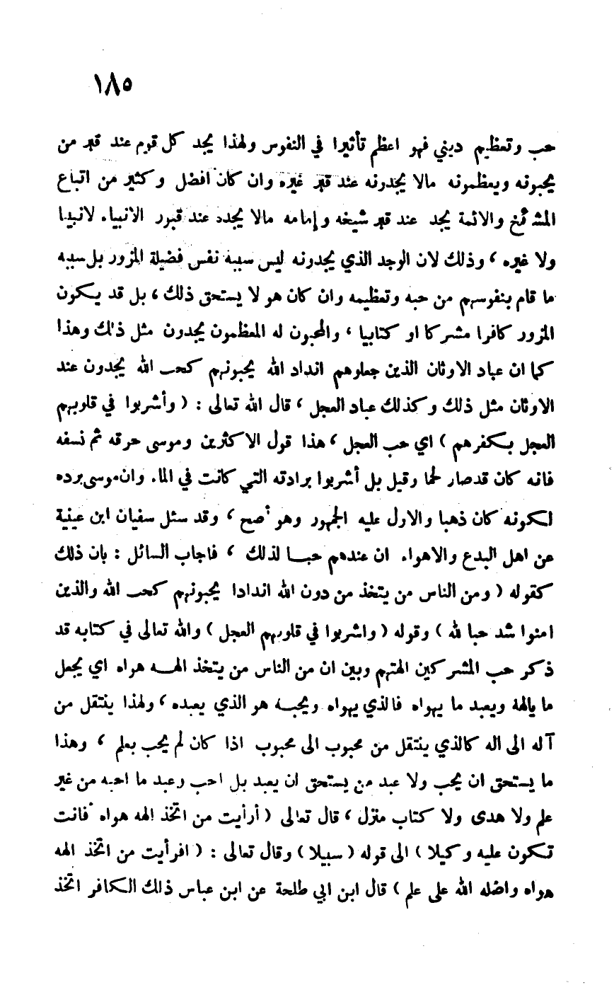 حب وتعظيم ديني فهو أعظم تأثيراً في النفوس ولهذا يجد كل قوم عند قبر من يحبونه ويعظمونه ما لا يجدونه عند قبر غيره وإن كان أفضل وكثير من أتباع المشائخ والأئمة لا يجد عند قبر شيخه وإمامه ما لا يجده عند قبور الأنبياء لا نبياً ولا غيره، وذلك لأن الوجد الذي يجدونه ليس سببه نفس فضيلة المزور بل سببه ما قام بنفوسهم من حبه وتعظيمه وإن كان هو لا يستحق ذلك، بل قد يكون المزور كافراً مشركاً أو كتابياً، والمحبون له المعظمون يجدون مثل ذلك وهذا كما أن عباد الأوثان الذين جعلوهم أنداداً يحبونهم كحب الله يجدون عند الأوثان مثل ذلك، وكذلك عباد العجل، قال الله تعالى: {وَأُشْرِبُوا فِي قُلُوبِهِمُ الْعِجْلَ بِكُفْرِهِمْ} أي حب العجل، هذا قول الأكثرين وموسى حرقه ثم نسفه فإنه كان قد صار لحماً وقيل بل أشربوا برادته التي كانت في الماء، وأن موسى برده لكونه كان ذهباً والأول عليه الجمهور وهو أصح، وقد سئل سفيان بن عيينة عن أهل البدع والأهواء أن عندهم حباً لذلك، فأجاب السائل: بأن ذلك كقوله: {وَمِنَ الْنَّاسِ مَنْ يَتَّخِذُ مِنْ دُونِ اللهِ أَنْدَادَاً يُحِبُونَهُمْ كَحُبِّ اللهِ والَّذِينَ آمَنُوا أَشَدُّ حُبَاً للهِ} وقوله: {وَأُشْرِبُوا فِي قُلُوبِهِمُ الْعِجْلَ} والله تعالى قد ذكر حب المشركين آلهتهم وبين أن من الناس من يتخذ إلهه هواه أي يجعل ما يألهه ويعبد ما يهواه فالذي يهواه ويحبه هو الذي يعبده، ولهذا ينتقل من آله إلى أله كالذي ينتقل من محبوب إلى محبوب إذا كان لم يحب بعلم، وهذا ما يستحق أن يحب ولا عبد من يستحق أن يعبد بل أحب وعبد ما أحبه من غير علم ولا هدى ولا كتاب منزله، قال تعالى: {أَرَأَيْتَ مَنِ اتَّخَذَ إِلَهَهُ هَوَاهُ أَفَأَنْتَ تَكُونُ عَلَيْهِ وَكِيلاً} إلى قوله: {سَبِيلاً} وقال تعالى: {أَفَرَأَيْتَ مَنِ اتَّخَذَ إِلَهَهُ هَوَاهُ وَأضَلَّهُ اللهُ عَلَى عِلْمٍ} قال ابن أبي طلحة عن ابن عباس ذلك الكافر اتخذ