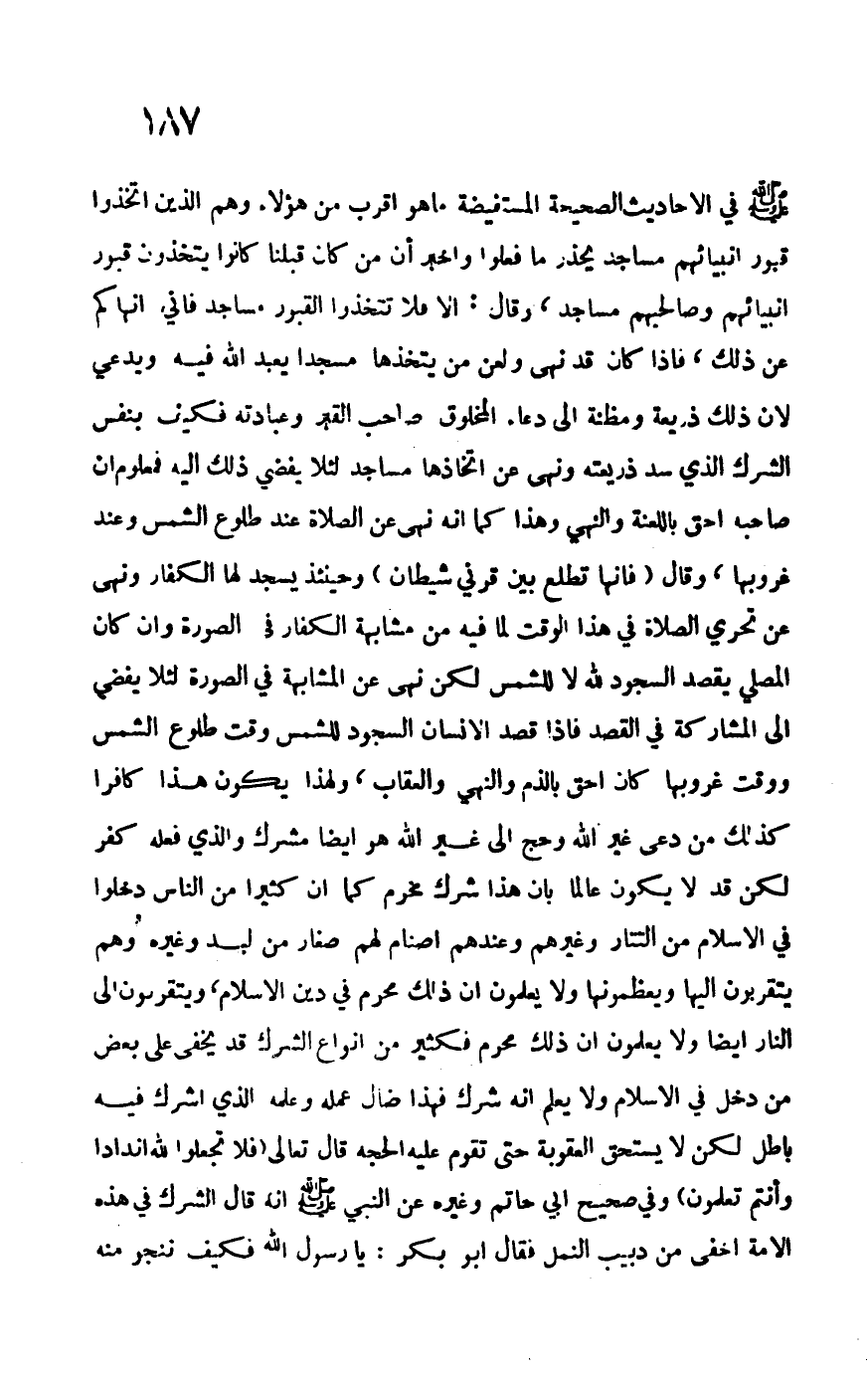 -صلى الله عليه وسلم- في الأحاديث الصحيحة المستفيضة ما هو أقرب من هؤلاء وهم الذين اتخذوا قبور أنبيائهم مساجد يحذر ما فعلوا وأخبر أن من كان من قبلنا كانوا يتخذوا قبور أنبيائهم وصالحيهم مساجد، وقال: "ألا فلا تتخذوا القبور مساجد فإني أنهاكم عن ذلك" فإذا كان قد نهى ولعن من يتخذها مسجداً يعبد الله فيه ويدعي لأن ذلك ذريعة ومظنة إلى دعاء المخلوق صاحب القبر وعبادته فكيف بنفس الشرك الذي سد ذريعته ونهى عن اتخاذها مساجد لئلا يفضي ذلك إليه فمعلوم أن صاحبه أحق باللعنة والنهي وهذا كما أنه نهى عن الصلاة عند طلوع الشمس وعند غروبها وقال: "فإنها تطلع بين قرني شيطان" وحيئنذٍ يسجد لها الكفار ونهى عن تحري الصلاة في هذا الوقت لما فيه من مشابهة الكفار في الصورة وإن كان المصلي يقصد السجود لله لا للشمس لكن نهتى عتن المشابهة في الصورة لئلا يفضي إلى المشاركة في القصد فإذا قصد الإنسان السجود للشمس وقت طلوع الشمس ووقت غروبها كان أحق بالذم والنهي والعقاب، ولهذا يكون هذا كافراً كذلك من دعا غير الله وحج إلى غير الله هو أيضاً مشرك والذي فعله كفر لكن قد لا يكون عالماً بأن هذا شرك محرم كما أن كثيراً من الناس دخلوا في الإسلام من التتار وغيرهم وعندهم أصنام لهم صغار من لبد وغيره وهم يتقربون إليها ويعظمونها ولا يعلمون أن ذلك محرم في دين الإسلام، ويتقربون إلى النار أيضاً ولا يعلمون أن ذلك محرم فكثيرا من أنواع الشرك قد يخفى على بعض من دخل في الإسلام ولا يعلم أنه شرك فهذا ضال عمله وعلمه الذي أشرك فيه باطل لكن لا يستحق العقوبة حتى تقوم عليه الحجة قال تعالى: {فَلَا تَجْعَلُوْا لِلهِ أَنْدَادَاً وَأَنْتُمْ تَعْلَمُونَ} وفي صحيح أبي حاتم وغيره عن النبي –صلى الله عليه وسلم- أنه قال: "الشرك في هذه الأمة أخفى من دبيب النمل" فقال أبو بكر: يا رسول الله فكيف ننجو منه