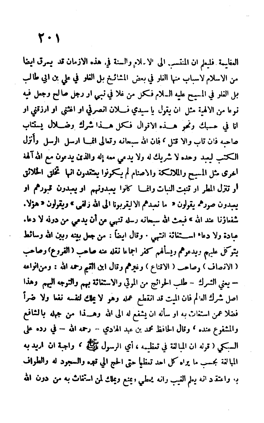 العظيمة فليعلم أن المنتسب إلى الإسلام والسنة في هذه الأزمان قد يمرق أيضاً من الإسلام لأسباب منها الغلو في بعض المشائخ بل الغلو في علي بن أبي طالب بل الغلو في المسيح –عليه السلام- فكل من غلا في نبي أو رجل صالح وجعل فيه نوعاً من الإلهية مثل أن يقول يا سيد فلان انصرني أو أغثني وارزقني أو أنا في حسبك ونحو هذه الأقوال فكل هذا شرك وضلال يستتاب صاحبه فإن تاب وإلا قتل، فإن الله سبحانه وتعالى إنما أرسل الرسل وأنزل الكتب ليعبد وحده لا شريك له ولا يدعى معه إله والذين يدعون مع الله آلهة أخرى مثل المسيح والملائكة والأصنام لم يكونوا يعتقدون أنها تخلق الخلائق أو تنزل المطر أو تنبت النبات وإنما كانوا يعبدونهم أو يعبدون قبورهم أو يعبدون صورهم يقولون {مَا نَعْبُدُهُمْ إِلَّا لِيُقَرِّبُونَا إِلَى اللهِ زُلْفَى} ويقولون {هَؤلَاء شُفَعَاؤنَا عِنْدَ اللهِ} فبعث الله سبحانه رسله تنهي عن أن يدعى من دونه لا دعاء عبادة ولا دعاء استغاثة. انتهى. وقال أيضاً: من جعل بينه وبين الله وسائط يتوكل عليهم ويدعوهم ويسألهم كفر إجماعاً نقله عنه صاحب "الفروع" وصاحب "الإنصاف" وصاحب "الإقناع" وغيرهم وقال ابن القيم –رحمه الله-: ومن أنواعه –يعني الشرك- طلب الحوائج من الموتى والاستغاثة بهم والتوجه إليهم وهذا أصل شرك العالم فإن الميت قد انقطع عمله وهو لا يملك لنفسهنفعاً ولا ضراً فضلاً عمن استغاث به أو سأله أن يشفع له إلى الله وهذا من جهله بالشافع والمشفوع عنده، وقال الحافظ محمد بن عبد الهادي –رحمه الله- في رده على السبكي "قوله إن المبالغة في تعظيمه، أي الرسول –صلى الله عليه وسلم- واجبة إن أريد به المبالغة بحسب ما يراه كل أحد تعظيماً حتى الحج إلى قبره والسجود له والطواف به واعتقاد أنه يعلم الغيب وأنه يعطي ويمنع ويملك لمن استغاث به من دون الله