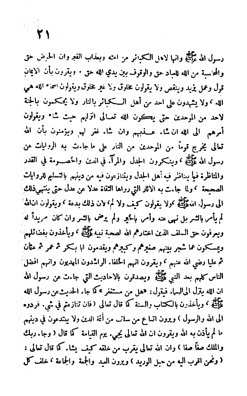 رسول الله –صلى الله عليه وسلم- وأنها لأهل الكبائر من أمته وبعذاب القبر وأن الحوض حق والمحاسبة من الله للعباد حق والوقوف بين يدي الله حق. ويقرون بأن الإيمان قول وعمل يزيد وينقص ولا يقولون مخلوق ولا غير مخلوق ويقولون أسماء الله هي الله، ولا يشهدون على أحد من أهل الكبائر بالنار ولا يحكمون بالجنة لأحد من الموحدين حتى يكون الله تعالى أنزلهم حيث شاء ويقولون أمرهم إلى الله إن شاء عذبهم وإن شاء غفر لهم ويؤمنون بأن الله تعالى يخرج قوماً من الموحدين من النار على ما جاءت به الروايات عن رسول الله –صلى الله عليه وسلم- وينكرون الجدل والمراء في الدين والخصومة في القدر والمناظرة فيما يناظر فيه أهل الجدل ويتنازعون فيه من دينهم بالتسليم للروايات الصحيحة، ولما جاءت به الآثار التي رواها الثقات عدلاً عن عدل حتى ينتهي ذلك إلى رسول الله –صلى الله عليه وسلم-، ولا يقولون كيف ولا لم؛ لأن ذلك بدعة، ويقولون إن الله لم يأمر بالشر بل نهى عنه وأمر بالخير ولم يرض بالشر وإن كان مريداً له ويعرفون حق السلف الذين اختارهم الله لصحبة نبيه –صلى الله عليه وسلم-، ويأخذون بفضائلهم ويمسكون عما شجر، ويقرون أنهم الخلفاء الراشدون والمهديون وأنهم أفضل الناس كلهم بعد النبي –صلى الله عليه وسلم- ويصدقون بالأحاديث التي جاءت عن رسول –صلى الله عليه وسلم- ويأخذون بالكتاب والسنة كما قال تعالى: {يَا أَيُّهَا الَّذِينَ آمَنُوا أَطِيعُوا اللَّهَ وَأَطِيعُوا الرَّسُولَ} ويرون اتباع من سلف من أئمة الدين ولا يبتدعون في دينهم ما لم يأذن به ويقرون أن الله تعالى يجئ يوم القيامة كما قال: {وَجَاءَ رَبُّكَ وَالْمَلَكُ صَفّاً صَفّاً} وأن الله تعالى يقرب من خلقه كيف يشاء كما قال تعالى: {وَنَحْنُ أَقْرَبُ إِلَيْهِ مِنْ حَبْلِ الْوَرِيدِ} ويرون العيد والجمعة والجماعة خلف كل