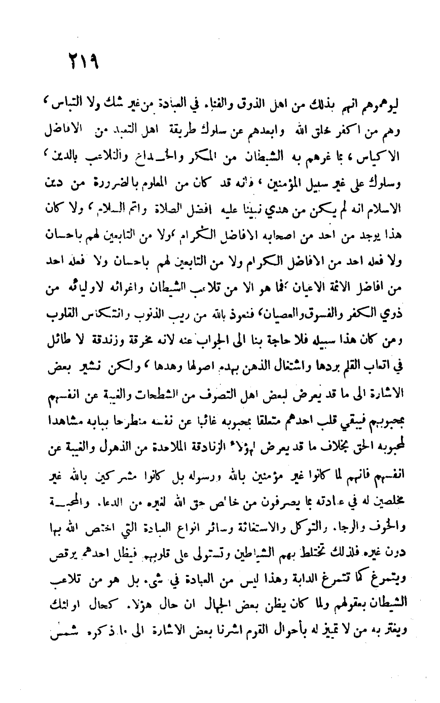 ليوهموهم أنهم بذلك من أهل الذوق والفناء في العبادة من غير شك ولا التباس، وهم من أكثر خلق الله وأبعدهم عن سلوك طريقة أهل التعبد من الأفاضل الأكياس، بما غرهم به الشيطان من المكر والخداع والتلاعب بالدين، وسلوك على غير سبيل المؤمنين، فإنه قد كان من المعلوم بالضرورة من دين الإسلام أنه لم يكن من هدي نبينا –عليه أفضل الصلاة وأتم السلام-، ولا كان هذا يوجد من أحد من أصحابه الأفاضل الكرام، ولا من التابعين لهم بإحسان ولا فعله أحد من الأفاضل الكرام، ولا من التابعين لهم بإحسان ولا فعله أحد من أفاضل الائمة الأعيان، فما هو إلا من تلاعب الشيطان وإغوائه لأوليائه من ذوي الكفر والفسوق والعصيان، فنعوذ بالله من ريب الذنوب وانتكاس القلوب ومن كان هذا سبيله فلا حاجة بنا إلى الجواب عنه لأنه مخرقة وزندقة لا طائل في إتعاب القلم بردها واشتغال الذهن بهدم أصولها وهدها، ولكن نشير بعض الإشارة إلى ما قد يعرض لبعض أهل التصوف من الشطحات والغيبة عن أنفسهم بمحبوبهم فيبقى قلب أحدهم متعلقاً بمحبوبه غائباً عن نفسه منطرحاً ببابه مشاهداً لمحبوبه الحق بخلاف ما قد يعرض لهؤلاء الزنادقة الملاحدة من الذهول والغيبة عن أنفسهم فإنهم لما كانوا غير مؤمنين بالله ورسوله كانوا مشركين بالله غير مخلصين له في عبادته بما يصرفون من خالص حق الله لغيره من الدعاء والمحبة والخوف والرجاء والتوكل والاستغاثة وسائر أنواع العبادة التي اختص الله بها دون غيره فلذلك تختلط بهم الشياطين وتستولي على قلوبهم فيظل أحدهم يرقص ويتمرغ كما تتمرغ الدابة وهذا ليس من العبادة في شيء بل هو من تلاعب الشيطان بعقولهم ولما كان يظن بعض الجهال أن حال هؤلاء كحال أولئك ويغتر به من لا تمييز له بأحوال القوم أشرنا بعض الإشارة إلى ما ذكره شمس