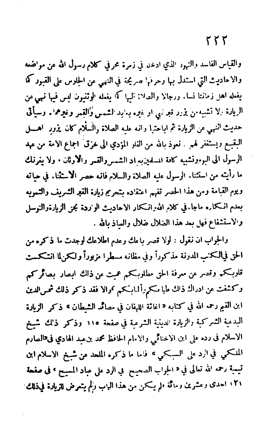 والجواب أن نقول: لولا قصر باعك وعدم اطلاعك لوجدت ما ذكره من الحق في الكتب المدونة مذكوراً وفي مظانه مسطراً مزبوراً ولكن لما انتكست قلوبكم وقصر عن معرفة الحق مطلوبكم عميت عن ذلك أبصار بصائركم وكشفت عن إدراك ذلك طباعكم، وإلا فقد ذكر ذلك شمس الدين ابن القيم –رحمه الله- في كتابه "إغاثة اللهفان في مصائد الشيطان" ذكر الزيارة البدعية الشركية والزيارة الدينية الشرعية في صفحة 115 وذكر ذلك شيخ الإسلام في رده على ابن الأخنائي والإمام الحافظ محمد بن عبد الهادي في "الصارم المنكي في الرد على السبكي" فأما ما ذكره الملحد عن شيخ الإسلام ابن تيمية –رحمه الله تعالى- في "الجواب الصحيح في الرد على عباد المسيح" في صفحة 121 إحدى وعشرين ومائة فلم يكن من هذا الباب ولم يتعرض للزيارة في ذلك