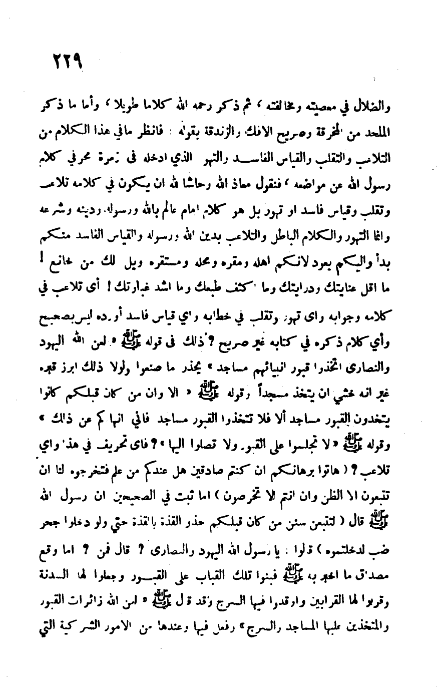والضلال في معصيته ومخالفته، ثم ذكر –رحمه الله- كلاماً طويلاً، وأما ما ذكر الملحد من المخرقة وصريح الإفك والزندقة بقوله فانظر ما في هذا الكلام من التلاعب والتقلب والقياس الفاسد والتهور الذي أدخله في زمرة محرفي كلام رسول الله عن مواضعه، فنقول معاذ الله وحاشا لله أن يكون في كلامه تلاعب وتقلب وقياس فاسد أو تهور بل هو كلام إمام عالم بالله ورسوله ودينه وشرعه وإنما التهور والكلام الباطل والتلاعب بدين الله ورسوله والقياس الفاسد منكم بدأ وإليكم يعود لأنكم أهله ومقره ومحله ومستقره ويل لك من خانع ما أقل عنايتك ودرايتك وما كشف طبعك وما أشد غباوتك أي تلاعب في كلامه وجوابه وأي تهور وتقلب في خطابه وأي قياس فاسد أورده ليس بصحيح وأي كلام ذكره في كتابه غير صريح؟ ذلك في قوله –صلى الله عليه وسلم-: "لعن الله اليهود والنصارى اتخذوا قبور أنبيائهم مساجد" يحذر ما صنعوا ولولا ذلك أبرز قبره غير أنه خشي أن يتخذ مسجداً، وقوله –صلى الله عليه وسلم-: "ألا وإن من كان قبلكم كانوا يتخذون القبور مساجد ألا فلا تتخذوا القبور مساجد فإني أنهاكم عن ذلك"، وقوله –صلى الله عليه وسلم-: "لا تجلسوا على القبور ولاتصلوا إليها" فأي تحريف في هذا وأي تلاعب؟ {هَاتُوْا بُرْهَانَكُمْ إِنْ كُنْتُمْ صَادِقِينَ} ، {هَلْ عِنْدَكُمْ مِنْ عِلْمٍ فَتُخْرِجُوهُ لَنَا إِنْ تَتْبِعُونَ إِلَّا الْظَّنَّ وَإِنْ أَنْتُمْ إِلَّا تَخْرُصُونَ} ، أما ثبت في الصحيحن أن رسول الله –صلى الله عليه وسلم- قال: "لتتبعن سنن من كان قبلكم حذو القذة بالقذة حتى ولو دخلوا جحر ضب لدخلتموه" قالوا يا رسول الله اليهود والنصارى؟ قال: "فمن؟ " أما وقع مصداق ما أخبر به –صلى الله عليه وسلم- فبنوا تلك القباب على القبور وجعلوا لها السدنة وقربوا لها القرابين وأوقدوا فيها السرج وقد قال –صلى الله عليه وسلم-: "لعن الله زائرات القبور والمتخذين عليها المساجد والسرج" وفعل فيها وعندنا من الأمور الشركية التي