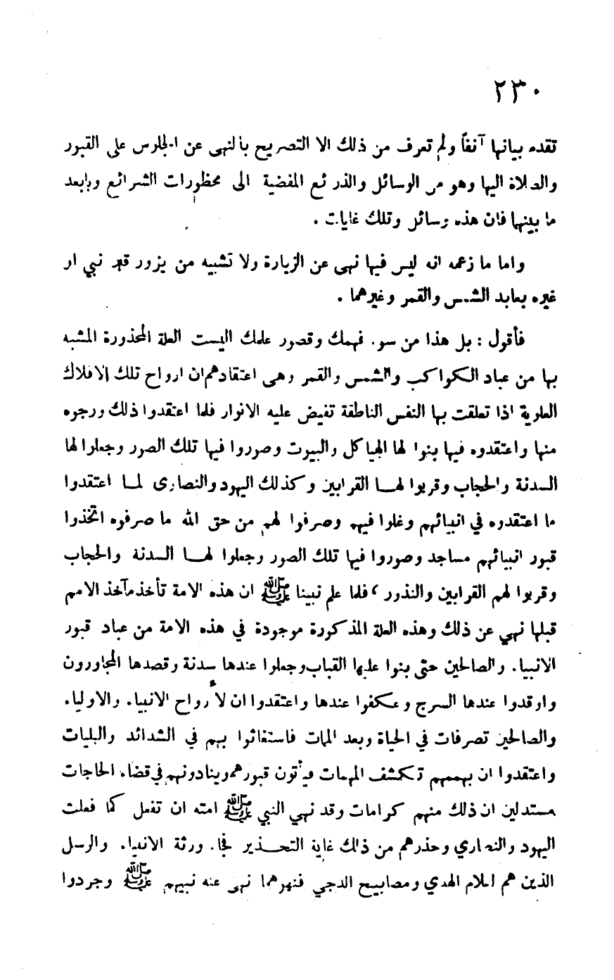 فأقول: بل هذا من سوء فهمك وقصور علمك أليست العلة المحذورة المشبه بها من عباد الكواكب والشمس والقمر وهي اعتقادهم أن أرواح تلك الأفلاك العلوية إذا تعلقت بها النفس الناطقة تفيض عليه الأنوار فلما اعتقدوا ذلك ورجوه منها واعتقدوا فيها بنوا لها الهياكل والبيوت وصوروا فيها تلك الصور وجعلوا لها السدنة والحجاب وقربوا له القرابين وكذلك اليهود والنصارى لما اعتقدوا ما اعتقدوه في أنبيائهم وغلوا فيهم وصرفوا لهم من حق الله ما صرفوه اتخذوا قبور أنبيائهم مساجد وصوروا فيها تلك الصور وجعلوا لها السدنة والحجاب وقربوا الهم القرابين والنذور، فلما علم نبينا –صلى الله عليه وسلم- أن هذه الأمة تأخذ مآخذ الأمم قبلها نهى عن ذلك وهذه العلة المذكورة موجودة في هذه الأمة من عباد قبور الأنبياء والصالحين حتى بنوا عليها القباب وجعلوا عندها سدنة وقصدها المجاورون وأقدوا عندها السرج وعكفوا عندها واعتقدوا أن لأرواح الأنبياء والأولياء والصالحين تصرفات في الحياة وبعد الممات استغاثوا بهم في الشدائد والبليات واعتقدوا أن بهممهم تكشف المهمات فيأتون قبورهم وينادونهم في قضاء الحاجات مستدلين أن ذلك منهم كرامات وقد نهى النبي –صلى الله عليه وسلم- أمته أن تفعل كما فعلت اليهود والنصارى وحذرهم من ذلك غاية التحذير فجاء ورثة الأنبياء والرسل الذين هم أعلام الهدى ومصابيح الدجى فنهوها ما نهى عنه نبيهم –صلى الله عليه وسلم- وجردوا