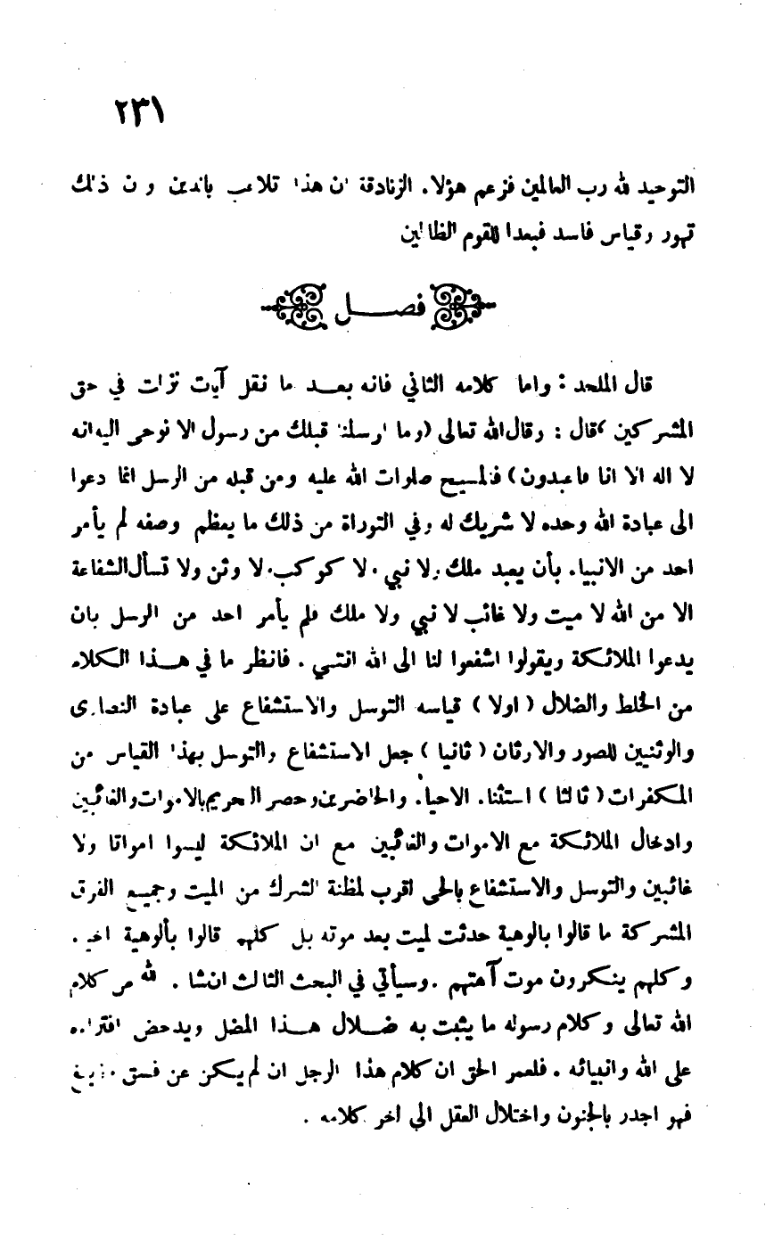 قال الملحد: وأما كلامه الثاني فإنه بعد ما نقل آيات نزلت في حق المشركين، قال: وقال الله تعالى: {وَمَا أَرْسَلْنَا مِنْ قَبْلِكَ مِنْ رَسُولٍ إِلَّا نُوحِي إِلَيْهِ أَنَّهُ لا إِلَهَ إِلَّا أَنَا فَاعْبُدُونِ} فالمسيح –صلوات الله عليه ومن قبله من الرسل- إنما دعوا إلى عبادة الله وحده لا شريك له وبالتوراة من ذلك ما يعظم وصفه لم يأمر أحد من الأنبياء بأن يعبد ملك ولا نبي ولا كوكب ولا وثن ولا تسأل الشفاعة إلا من الله لا ميت ولا غائب لا نبي ولا ملك، فلم يأمر أحد من الرسل بأن يدعوا الملائكة ويقولوا اشفعوا لنا إلى الله. انتهى فانظر ما في هذا الكلام من الخلط والضلال "أولاً" قياسه التوسل والاستشفاع والتوسل بهذا على عبادة النصارى والوثنيين للصور والأوثان. "ثانياً" جعل الاستشفاع والتوسل بهذا القياس من المكفرات. "ثالثاً" استثناء الأحياء والحاضرين وحصر الحريم بالأموات والغائبين وإدخال الملائكة مع الأموات والغائبين مع أن الملائكة ليسوا أمواتاً ولا غائبين والتوسل والاستشفاع بالحي أقرب لمظنة الشرك من الميت وجميع الفرق المشركة ما قالوا بألوهية حدثت لميت بعد موته بل كلهم قالوا بألوهية وكلهم ينكرون موت آلهتهم، وسيأتي في البحث الثالث إن شاء من كلام الله تعالى وكلام رسوله ما يثبت به ضلال هذا المضل ويدحض افتراءه على الله وأنبيائه، فلعمر الحق أن كلام هذا الرجل إن لم يكن عن فسق وزيغ فهو أجدر بالجنون واختلال العقل إلى آخر كلامه.