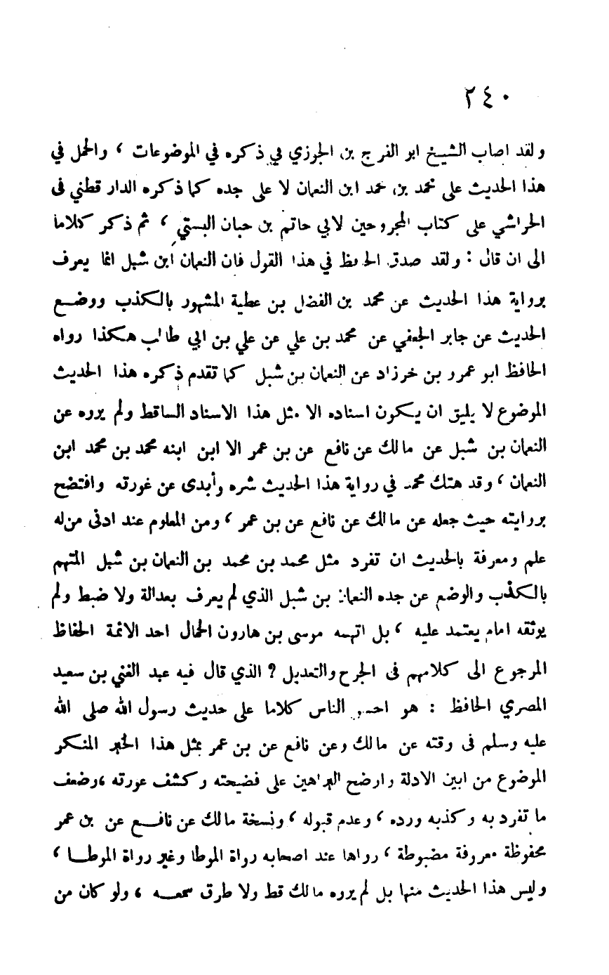 ولقد أصاب الشيخ أبو الفرج بن الجوزي في ذكره في الموضوعات، والحمل في هذا الحديث على محمد بن محمد ابن النعمان لا على جده كما ذكره الدارقطني في الحواشي على كتاب "المجروحين لأبي حاتم بن حبان البستي، ثم ذكر كلاماً إلى أن قال: ولقد صدق الحافظ في هذا القول فإن النعمان ابن شبل إنما يعرف برواية هذا الحديث عن محمد بن الفضل بن عطية المشهور بالكذب ووضع الحديث عن جابر الجعفي عن محمد بن علي عن علي بن أبي طالب هكذا رواه الحافظ أبو عمرو بن خرزاد عن النعمان بن شبل كما تقدم ذكره هذا الحديث الموضوع لا يليق أن يكون إسناده إلا مثل هذا الإسناد الساقط ولم يروه عن النعمان بن شبل عن مالك عن نافع عن ابن عمر إلا ابن ابنه محمد بن محمد ابن النعما، وقد هتك محمد في رواية هذا الحديث شره وأبدى عن غورته وافتضح بروايته حيث جعله عن مالك عن نافع عن ابن عمر، ومن المعلوم عند من أدنى له علم ومعرفة بالحديث أن تفرد مثل محمد بن محمد بن النعمان بن شبل المتهم بالكذب والوضع عن جده النعمان بن شبل الذي لم يعرف بعدالة ولا ضبط ولم يوثقه إمام يعتمد عليه، بل اتهمه موسى بن هارون الحمال أحد الأئمة الحفاظ المرجوع إلى كلامهم في الجرح والتعديل الذي قال فيه عبد الغني بن سعيد المصري الحافظ: هو أحسن الناس كلاماً على حديث رسول الله –صلى الله عليه وسلم- في وقته عن مالك عن نافع عن ابن عمر بمثل هذا الخبر المنكر الموضوع من أبين الأدلة وأوضح البراهين على فضيحته وكشف عورته، وضعف ما تفرد به وكذبه ورده، وعدم قبوله، ونسخة مالك عن نافع عن ابن عمر محفوظة معروفة ومضبوطة، رواها عنه أصسحابه رواة الموطأ وغير رواة الموطأ، وليس هذا الحديث منها بل لم يروه مالك قط ولا طرق سمعه، ولو كان من