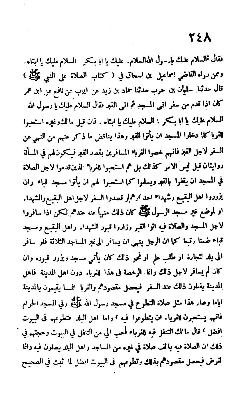 فقال: السلام عليك يا رسول الله السلام عليك يا أبا بكر السلام عليك يا أبتاه وممن رواه القاضي إسماعيل بن إسحاق في "كتاب الصلاة على النبي –صلى الله عليه وسلم-" قال حدثنا سليمان بن حرب حدثنا حماد بن زيد عن أيوب عن نافع عن ابن عمر كان إذا قدم من سفر أتى المسجد ثم أتى القبر فقال السلام عليك يا رسول الله السلام عليك يا أبا بكر: السلام عليك يا أبتاه فإن قيل مالك وغيره استحبوا للغرباء كلما دخلوا المسجد أن يأتوا القبر وهذا يناقض ما ذكر عنهم من النبي عن السفر لأجل القبر فإنهم خصوا الغرباء المسافرين بقصد القبر فيكون لهم في المسألة روايتان قيل ليس الأمر كذلك بل هم استحبوا للغرباء الذين قدموا لأجل الصلاة في المسجد أن يقفوا بالقبر ويسلموا كما استحبوا لهم أن يأتوا مسجد قباء وأن يزوروا أهل البقيع وشهداء أحد، وهم لو قصدوا السفر لأجل أهل البقيع والشهداء أو لموضع غير مسجد رسول الله –صلى الله عليه وسلم- كان ضلك منهياً عنه عندهم لكن إذا سافروا لأجل المسجد والصلاة فيه أتوا القبر وزاروا قبور الشهداء وأهل البقيع ومسجد قباء ضمناً وتبعاً كما أن الرجل ينهى أن يسافر إلى غير المساجد الثلاثة فلو سافر إلى بلد لتجارة أو طلب علم أو نحو ذلك كأن يأتي مسجد ويزور قبره وإن كان لم يسافر لأجل ذلك وإنما الرخصة في هذا للغرباء دون أهل المدينة فأهل المدينة يفعلون ذلك عند السفر فيحصل مقصودهم والغرباء إنما يقيمون بالمدينة أياماً وصار هذا مثل صلاة التطوع في مسجد رسول الله –صلى الله عليه وسلم- وفي المسجد الحرام فإنهم يستحبون للغرباء أن يتطوعوا فيه، وأما أهل البلد فتطوعهم في البيوت أفضل، قال مالك التنفل فيه للغرباء أحب إلي من التنفل في البيوت وحجتهم في ذلك أن الصلاة فيه بألف صلاة في غيره من المساجد وأهل البلد يصلون فيه دائماً لغرض فيحصل مقصودهم بذلك وتطوعهم في البيوت أفضل لما ثبت في الصحيح