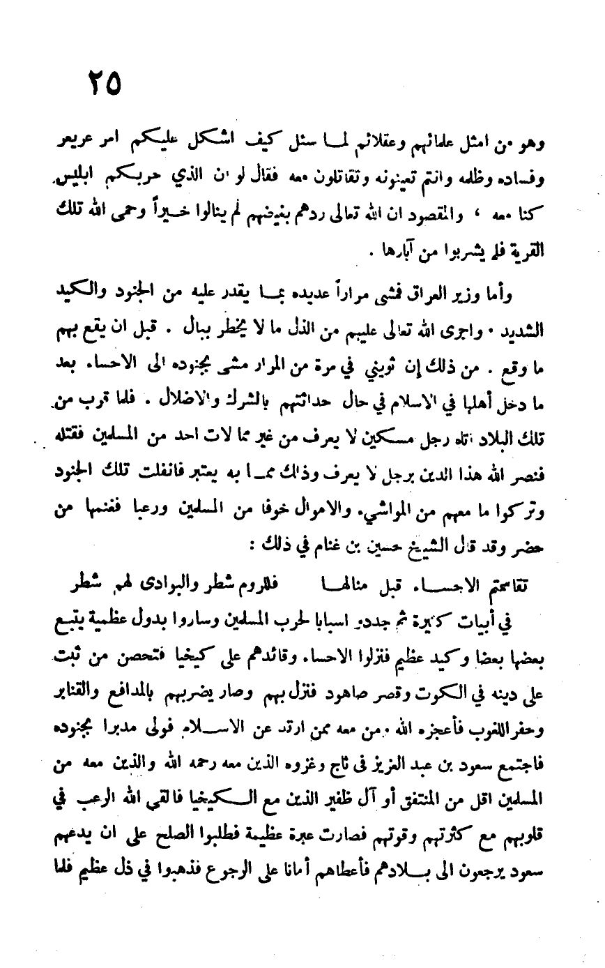 في أبيات كثيرة ثم جددوا أسباب الحرب المسلمين وساروا بدول عظيمة يتبع بعضها بعضاًَ وكيد عظيم فنزلوا الإحساء وقائدهم علي كيخيا فتحصن من ثبت على دينه في الكوت وقصر صاهود فنزل بهم وصار يضربهم بالمدافع والقنابر وحفر اللغوب فأعجزه الله ومن معه ممن ارتد عن الإسلام فولى مدبراً بجنوده فاجتمع سعود بن عبد العزيز في ثاج وغزوة الذين معه –رحمه الله- والذين معه من المسلمين أقل من المنتفق أو آل ظفير الذين مع الكيخيا فألقى الله الرعب في قلوبهم مع كثرتهم وقوتهم فصارت عبرة عظيمة فطلبوا الصلح على أن يدعهم سعود يرجعون إلى بلادهم فأعطاهم أماناً على الرجوع فذهبوا في ذل عظيم فلما.