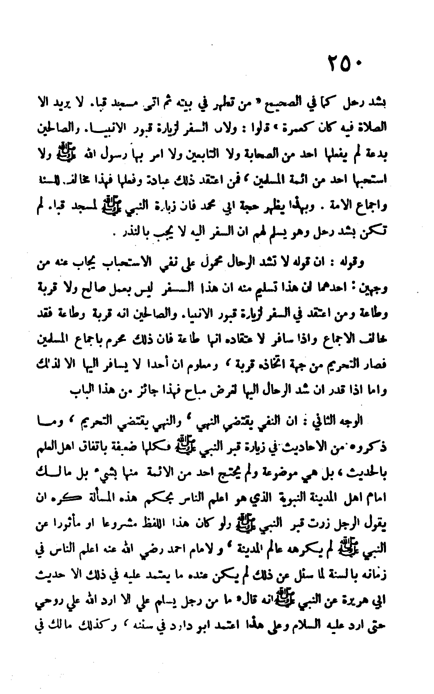 بشد رحل كما ثبت في الصحيح "من تطهر في بيته ثم أتى مسجد قباء لا يريد إلا الصلاة فيه كان كعمرة" قالوا: ولأن السفر لزيارة قبور الأنبياء والصالحين بدعة لم يفعلها أحد من الصحابة ولا التابعين ولا أمر بها رسول الله –صلى الله عليه وسلم- ولا استحبها أحد من أئمة المسلمين، فمن اعتقد ذلك عبادة وفعلها فهذا مخالف للسنة وإجماع الأمة، وبهذا يظهر حجة أبي محمد فإن زيارة النبي –صلى الله عليه وسلم- للمسجد قباء لم تكن بشد رحل وهو يسلم لهم أن السفر إليه لا يجب بالنذر.