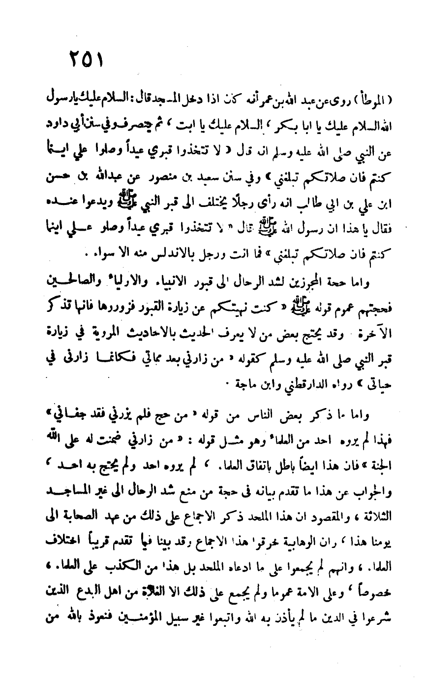 "الموطأ" روى عن عبد الله بن عمر أنه كان إذا دخل المسجد قال: السلام عليك يا رسول الله السلام عليك يا أبا بكر، السلام عليك يا أبت، ثم ينصرف في سنن أبي داود عن النبي –صلى الله عليه وسلم- أنه قال: "لا تتخذوا قبري عيداً وصلوا عليّ أينما كنتم فإن صلاتكم تبلغني" وفي سنن سعيد بن منصور عن عبد الله بن حسن بن علي بن أبي طالب أنه رأى رجلاً يختلف إلى قبر النبي –صلى الله عليه وسلم- ويدعوا عنده فقال يا هذا أن رسول الله –صلى الله عليه وسلم- قال: "لا تتخذوا قبري عيداً وصلوا علي أينما كنتم فإن صلاتكم تبلغني" فما أنت ورجل بالأندلس منه إلا سواء.