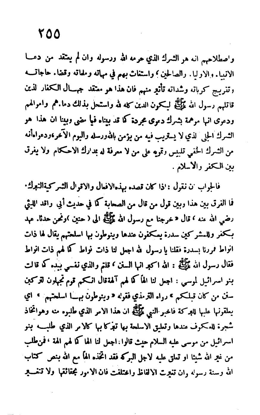 واصطلاحهم أنه هو الشرك الذي حرمه الله ورسوله وإن لم يعتقد من دعاء الأنبياء والأولياء والصالحين، واستغاث بهم في مهماته وقضاء حاجاجته وتفريج كرباته وشداته تأثير منهم فإن هذا معتقد جهال الكفار الذين قاتلهم رسول الله –صلى الله عليه وسلم- ليكون الدين كله لله واستحل بذلك دماءهم وأموالهم ودعوى أنها موهمة بشرك دعوى مجردة كما قد بيناه فيما مضى وبينا أن هذا هو من الشرك الخفي تلبيس وتمويه على من لا معرفة له بمدارك الأحكام ولا يفرق بين الكفر والإسلام.