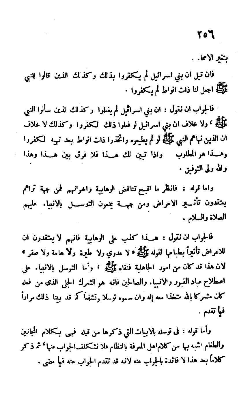 فالجواب أن نقول: هذا كذب على الوهابية فإنهم لا يعتقدون أن للأعراض تأثيراً بطباعها لقوله –صلى الله عليه وسلم- "لا عدوى ولا طيرة ولا هامة ولا صفر" لأن هذا قد كان من أمور الجاهلية فنفاه –صلى الله عليه وسلم-، وأما التوسل بالأنبياء على اصطلاح عباد القبور والأنبياء والصالحين فإنه هو الشرك الجلي الذي من فعله كان مشركاً متخذاً معه إله وإن سموه توسلاً وتشفعاً كما قد بينا ذلك مراراً فيما تقدم.