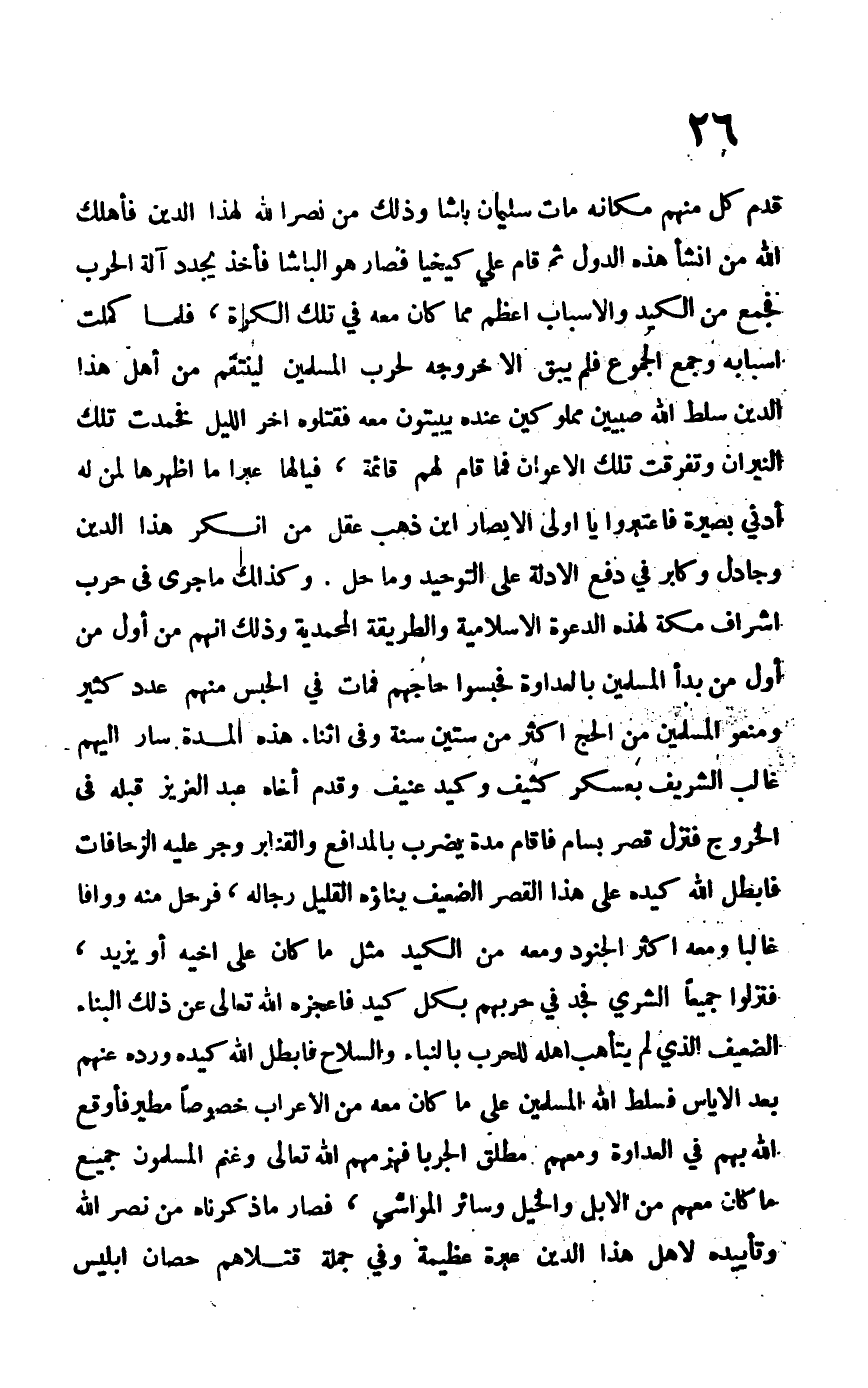 قدم كل منهم مكانه مات سليمان باشا وذلك من نصر الله لهذا الدين فأهلك الله من أنشأ هذه الدول ثم قام علي كيخيا فصار هو الباشا فأخذ يجدد آلة الحرب فجمع من الكيد والأسباب أعظم مما كان معه في تلك الكرة، فلما كملت أسبابه وجمع الجموع فلم يبق إلا خروجه لحرب المسلمين لينتقم من أهل هذا الدين سلط الله صبيين مملوكين عنده يبيتون معه فقتلوه آخر الليل فحمدت تلك النيران وتفرقت تلك الأعوان فما قام لهم قائمة، فيالها عبراً ما أظهرها لمن له أدنى بصيرة فاعتبروا يا أولي الأبصار أين ذهب عقل من أنكر هذا الدين وجادل وكابر في دفع الأدلة على التوحيد وما حل، وكذلك ما جرى في حرب أشراف مكة لهذه الدعوة الإسلامية والطريقة المحمدية وذلك أنهم من أول من بدأ المسلمين بالعداوة فحبسوا حاجهم فمات في الحبس منهم عدد كثير ومنعوا المسلمين من الحج أكثر من ستين سنة وفي أثناء هذه المدة سار إليهم غالب الشريف بعسكر كثيف وكيد عنيف وقدم أخاه عبد العزيز قبله في الخروج فنزل قصر بسام فأقام مدة يضرب بالمدافع والقنابر وجر عليه الزحافات فأبطل الله كيده على هذا القصر الضعيف بناؤه القليل رجاله، فرحل منه ووافا غالباً ومعه أكثر الجنود ومعه من الكيد مثل ما كان على أخيه أو يزيد، فنزلوا جميعاً الشري فجد في حربهم بكل كيد فأعجزه الله تعالى عن ذلك البناء الضعيف الذي لم يتأهب أهله للحرب بالنباء والسلاح فأبطل الله كيده ورده عنهم بعد الإياس فسلط الله المسلمين على ما كان معه من الأعراب خصوصاً مطير فأوقع الله بهم في العداوة ومعهم مطلق الجربا فهزمهم الله تعالى وغنم المسلمون جميع ما كان معهم من الإبل والخيل وسائر المواشي، فصار ما ذكرناه من نصر الله وتأييده لأهل هذه الدين عبرة عظيمة وفي جملة قتلاهم حصان إبليس