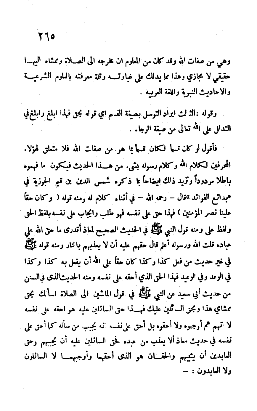 فأقول لو كان قسماً لكان قسماً بما هو من صفات الله فلا متعلق لهؤلاء المحرفين لكلام الله وكلام رسوله بشيء من هذا الحديث فيكون ما فهموه باطلاً مردوداً ونزيد ذلك إيضاحاً بما ذكره شمس الدين ابن قيم الجوزية في "بدائع الفوائد" قال –رحمه الله- في أثناء كلام له ومنه قوله: {وَكَانَ حَقّاً عَلَيْنَا نَصْرُ الْمُؤْمِنِينَ} فهذا حق على نفسه فهو طلب وإيجاب على نفسه بلفظ الحق ولفظ على ومنه قول النبي –صلى الله عليه وسلم- في الحديث الصحيح لمعاذ "أتدري ما حق الله على عباده" قلت الله ورسوله أعلم قال "حقهم عليه أن لا يعذبهم بالنار" ومنه قوله –صلى الله عليه وسلم- في غير حديث من فعل كذا وكذا كان حقاً على الله أن يفعل به كذا وكذا في الوعد وفي الوعيد فهذا الحق الذي أحقه على نفسه ومنه الحديث الذي في السنن من حديث أبي سعيد عن النبي –صلى الله عليه وسلم- في قول الماشين إلى الصلاة "أسألك بحق ممشاي هذا وبحق السائلين عليك" فهذا حق السائلين عليه هو أحقه على نفسه لا أنهم هم أوجبوه ولا أحقوه بل أحق على نفسه أنه يجيب من سأله كما أحق على نفسه في حديث معاذ أن لا يعذب من عبده فحق السائلين عليه أن يجيبهم وحق العابدين أن يثيبهم والحقان هو الذي أحقهما وأوجبهما لا السائلون ولا العابدون:-