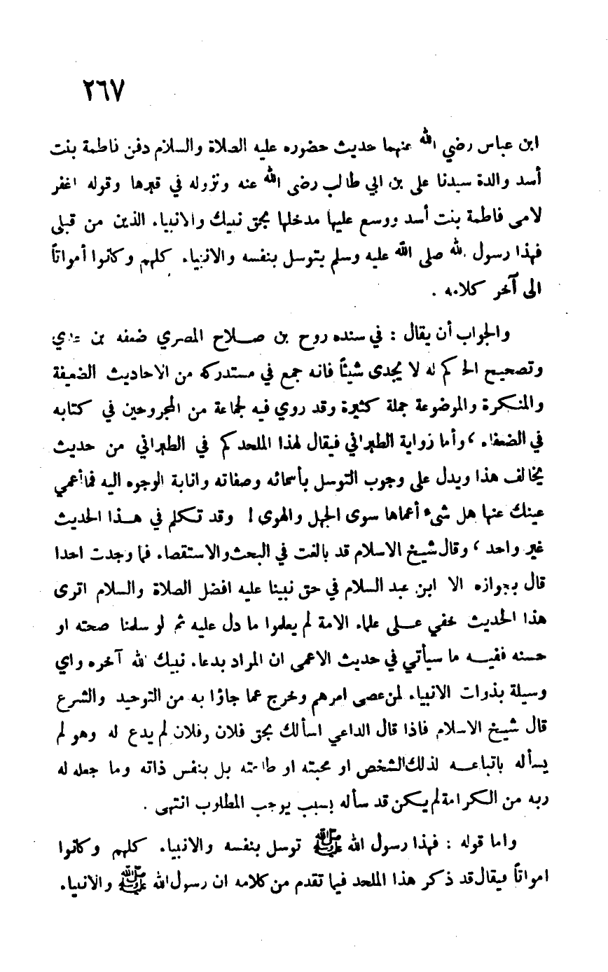 ابن عباس –رضي الله عنهما- حديث حضوره –عليه الصلاة والسلام- دفن فاطمة بنت أسد والدة سيدنا علي بن أبي طالب –رضي الله عنه- ونزوله في قبرها وقوله: "اغفر لأمي فاطمة بنت أسد ووسع عليها مدخلها بحق نبيك والأنبياء الذين من قبلي" فهذا رسول الله –صلى الله عليه وسلم- يتوسل بنفسه والأنبياء كلهم وكانوا أمواتاً إلى آخر كلامه. والجواب أن يقال: في سنده روح بن صلاح المصري ضعه ابن عدي وتصحيح الحاكم له لا يجدي شيئاً فغنه جمع في مستدركه من الأحاديث الضعيفة والمنكرة والموضوعة جملة كثيرة وقد روي فيه لجماعة من المجروحين في كتابه يخالف هذا ويدل على وجوب التوسل بأسمائه وصفاته وإنابة الوجوه إليه فما أعمى عينك عنها هل شيء أعماها سوى الجهل والهوى! وقد تكلم في هذا الحديث غير واحد، وقال شيخ الإسلام قد بالغت في البحث والاستقصاء فما وجدت أحداً قال بجوازه إلا ابن عبد السلام في حق نبينا –عليه أفضل الصلاة والسلام- أترى هذا الحديث يخفى على علماء الامة لم يعلموا ما دل عليه ثم لو سلمنا صحته أو حسنه ففيه ما سيأتي في حديث الأعمى أن المراد بدعاء نبيك الله آخره وأي وسيلة بذوات الأنبياء لمن عصى أمرهم وخرج عما جاءوا به من التوحيد والشرع قال شيخ الإسلام فإذا قال الداعي أسألك بحق فلان وفلان لم يدع له وهو لم يسأله باتابعه لذلك الشخص او محبته او طاعته بل نفس ذاته وما جعله له ربه من الكرامة لم يكن قد سأله بسبب يوجب المطلوب. انتهى.