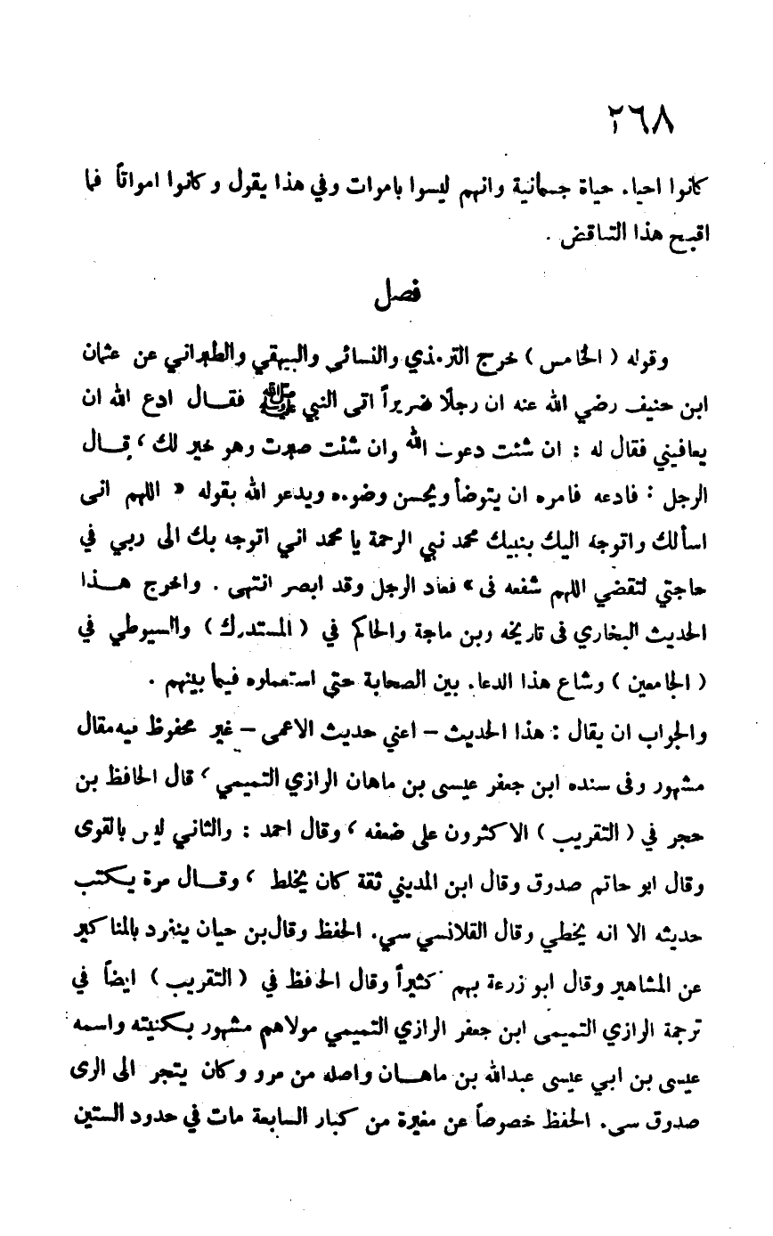 والجواب ان يقال: هذا الحديث –أعني حديث الأعمى- غير محفوظ فيه مقال مشهور وفي سنده ابن جعفر عيسى بن ماهان الرازي التيمي قال الحافظ ابن حجر في "التقريب" الأكثرون على ضعفه، وقال أحمد: والثاني ليس بالقوي، قال أبو حاتم صدوق وقال ابن المديني ثقة كان يخلط، وقال مرة يكتب حديثه إلا أنه يخطئ وقال القلانسي سيئ الحفظ وقال ابن حبان ينفرد بالمناكير من المشاهير وقال أبو زرعة يهم كثيراً وقال الحافظ في "التقريب" أيضاً في ترجمة الرازي التميمي ابن جعفر الرازي التميمي مولاهم مشهور بكنيته واسمه عيسى بن أبي عيسى عبد الله بن ماهان وأصله من مرو وكان يتجر إلى الري صدوق سيء الحفظ خصوصاً عن مغيرة من كبار السابعة مات في حدود الستين
