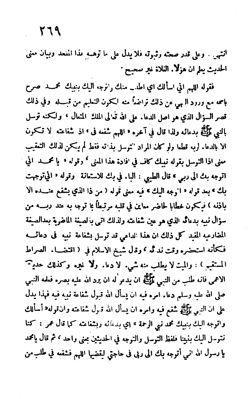 فقوله: اللهم إني أسألك أي أطلب منك وأتوجه إليك بنبيك محمد صرح باسمه مع ورود النهي عن ذلك تواضعاً منه لكون التعليم من قبله وفي ذلك قصر السؤال الذي هو أصل الدعاء على الله تعالى الملك المتعال، ولكنه توسل بالنبي –صلى الله عليه وسلم- بدعاه ولذا قال في آخره "اللهم شفعه في" إذ شفاعته لا تكون إلا بالدعاء لربه قطعاً ولو كان المراد التوسل بذاته فقط لم يكن لذلك التعقيب معنى إذ التوسل بقوله نبيك كاف في إفادة هذا المعنى، وقوله: يا محمد إني أتوجه بك إلى ربي قال الطيبي: الباء في بك للاستعانة وقوله: "إني توجهت بك" بعد قوله: "أتوجه إليك" فيه معنى قوله: {مَنْ ذَا الَّذِي يَشْفَعُ عِنْدَهُ إِلَّا بِإِذْنِهِ} فيكون خطاباً لحاضر معاين في قلبه مرتبطاً بما توجه به عند ربه من سؤال نبيه بدعائه الذي هو عين شفاعته ولذلك أتى بالصيغة الماضوية بعد الصيغة المضارعية المفيدة كل ذلك أن هذا الداعي قد توسل بشفاعة نبيه في دعائه فكأنه استحضره وقت ندائه، وقال شيخ الإسلام في "اقتضاء الصراط المستقيم": الميت لا يطلب منه شيء لا دعاء ولا غيره وكذلك حديث الأعمى فإنه طلب من النبي –صلى الله عليه وسلم- أن يدعو له أن يرد عليه بصره فعلمه النبي –صلى الله عليه وسلم- شفع فيه وأمره أن يسأل الله قبول شفاعته وأن قوله: "أسألك وأتوجه إليك بنبيك محمد نبي الرحمة" أي بدعائه وشفاعته كما قال عمرك كنا نتوسل إليك بنبينا فلفظ التوسل والتوجه في الحديثين بمعنى واحد، ثم قال يا محمد يا رسول الله إني أتوجه إليك إلى ربي في حاجتي ليقضيها اللهم فشفعه في طلب من