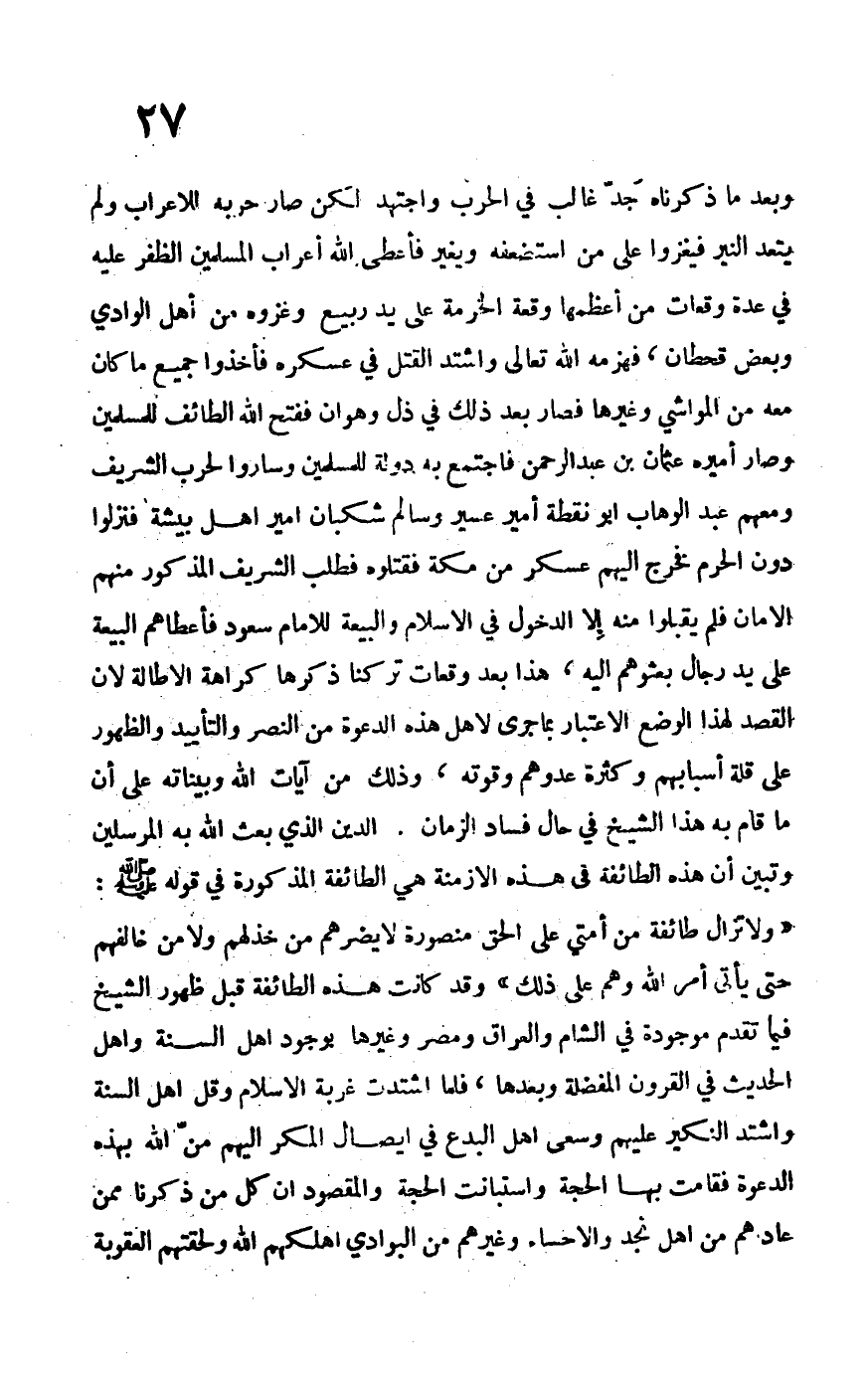 وبعدما ذكرناه جدّ غالب في الحرب واجتهد لكن صار حربه للأعراب ولم يتعد النير فيغزوا على من استضعفه ويغير فأعطى الله أعراب المسلمين الظفر عليه في عدة وقعات من أعظمها وقعة الخرمة على يد ربيع وغزوه من أهل الوادي وبعض قحطان، فهزمه الله تعالى واشتد القتل في عسكره فأخذوا جميع ما كان معه من المواشي وغيرها فصار بعد ذلك في ذل وهوان ففتح الله وساروا لحرب الشريف ومعهم عبد الوهاب أبو نقطة أمير عسير وسالم شكبان أمير أهل بيشة فنزلوا دون الحرم فخرج إليهم عسكر من مكة فقتلوه فطلب الشريف المذكور منهم الأمان فلم يقبلوا منه إلا الدخول في الإسلام والبيعة للإمام سعود فأعطاهم البيعة على يد رجال بعثوهم إليه، هذا بعد وقعات تركنا ذكرها كراهة الإطالة لأن القصد لهذا الوضع الاعتبار بما جرى لأهل هذه الدعوة من النصر والتأييد والظهور على قلة أسبابهم وكثرة عدوهم وقوته، وذلك من آيات الله وبيناته على أن ما قام به هذا الشيخ في حال فساد الزمان. الدين الذي بعث الله به المرسلين وتبين أن هذه الطائفة في هذه الأزمنة هي الطائفة المذكورة في قوله –صلى الله عليه وسلم-: "ولا تزال طائفة من أمتي على الحق منصورة لا يضرهم من خذلهم ولا من خالفهم حتى يأتي أمر الله وهم على ذلك" وقد كانت هذه الطائفة قبل ظهور الشيخ فيما تقدم موجودة في الشام والعراق ومصر وغيرها بوجود أهل السنة وأهل الحديث في القرون المفضلة وبعدها، فلما اشتدت غربة الإسلام وقل أهل السنة واشتد النكير عليهم وسعى أهل البدع في إيصال المكر إليهم من الله بهذه الدعوة فقامت بها الحجة واستبانت الحجة والمقصود أن كل من ذكرنا ممن عاداهم من أهل نجد والإحساء وغيرهم من البوادي أهلكهم الله ولحقتهم العقوبة