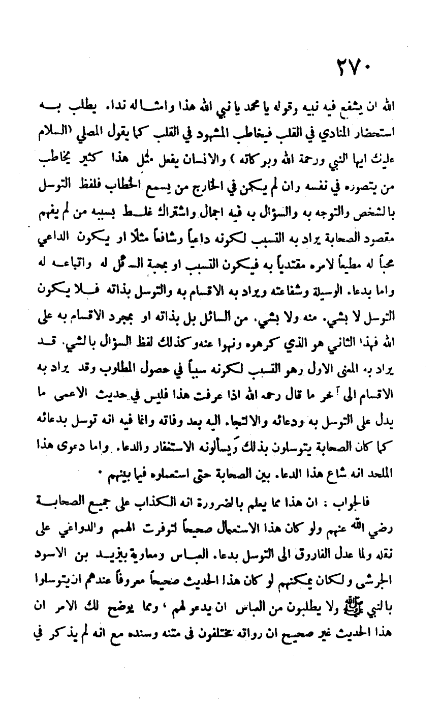 من الله أن يشفع فيه وقوله يا محمد يا نبي الله هذا وامثاله نداء يطلب به استحضار المنادي في القلب فيخاطب المشهود في القلب كما يقول المصلي "السلام عليك أيها النبي ورحمة الله وبركاته" والإنسان يفعل مثل هذا كثير يخاطب من يتصوره في نفسه وإن لم يكن في الخارج من يسمع الخطاب فلفظ التوسل بالشخص والتوجه به والسؤال به فيه إجمال واشتراك غلط بسببه من لم يفهم مقصود الصحابة يراد به التسبب لكونه داعياً وشافعاً مثلاً أو يكون الداعي محباً له ومطيعاً لأمره مقتدياً به فيكون التسبب أو بمحبة السائل له واتباعه له وإما بدعاء الوسيلة وشفاعته ويراد به الإقسام به والتوسل بذاته فلا يكون التوسل لا بشيء منه ولا بشيء من السائل بل بذاته أو بمجرد الغقسام به على الله فهذا الثاني هو الذي كرهوه ونهوا عنه وكذلك لفظ السؤال بالشيء قد يراد به المعنى الأول وهو التسبب لكونه سبباً في حصول المطلوب وقد يراد به الإقسام إلى آخر ما قال –رحمه الله- إذا عرفت هذا فليس في حديث الأعمى ما يدل على التوسل به ودعائه والالتجاء إليه بعد وفاته وإنما فيه أنه توسل بدعائه كما كان الصحابة يتوسلون بذلك ويسألونه الاستغفار والدعاء، وأما دعوى هذا الملحد أنه شاع هذا الدعاء بين الصحابة حتى استعملوه فيما بينهم.
