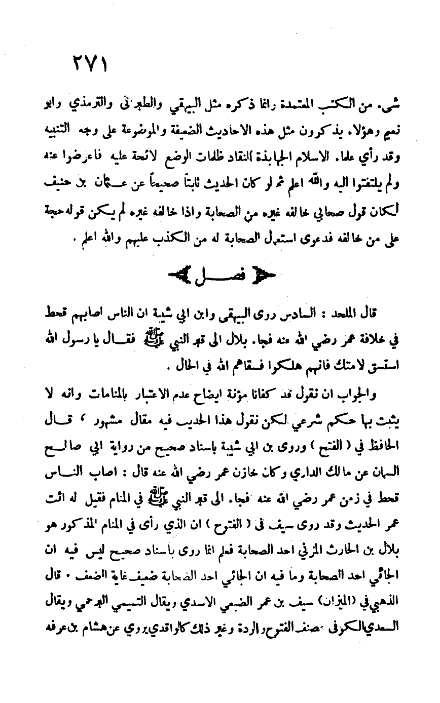والجواب أن نقول قد كفانا مؤنة إيضاح عدم الاعتبار بالمنامات وأنه لا يثبت بها حكم شرعي لكن نقول هذا الحديث فيه مقال مشهورن قال الحافظ في "الفتح" وروى ابن أبي شيبة بإسناد صحيح من رواية أبي صالح السمان عن مالك الداري وكان خازن عمر –رضي الله عنه- قال: أصاب الناس قحط في زمن عمر –رضي الله عنه- فجاء إلى قبر النبي –صلى الله عليه وسلم- في المنام فقيل له ائت عمر الحديثن وقد روى سيف في "الفتوح" ان الذي رأى في المنام المذكور هو بلال بن الحارث المزني أحد الصحابة فعلم إنما روي بإسناد صحيح ليس فيه أن الجائي أحد الصحابة وما فيه أن الجائي أحد الصحابة ضعيف غاية الضعفز قال الذهبي في "الميزان" سيف بن عمر الضبعي الأسدي ويقال التميمي البرحمي ويقال السعدي الكوفي مصنف الفتوح والردة وغير ذلك كالواقدي يروي عن هشام بن عرفة