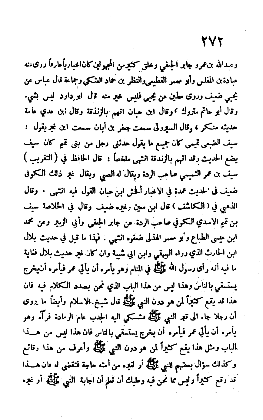 وعبد الله بن عمرو جابر الجعفي وخلق كثير ممن المجهولين كان إخبارياً عارفاً روى عنه عبادة بن المفلس وأبو معمر القطيعي والنظر بن حماد العتكي وجماعة قال عباس عن يحيى ضعيف وروى مطين عن يحيى فليس خير منه قال أبو داود ليس بشيء وقال أبو حاتم متروكن وقال ابن حبان اتهم بالزندقة وقال ابن عدي عامة حديثه منكر، وقال السيروتي سمعت ابن نمير يقول: سيف الضبعي تميمي كان جميع ما يقول حدثني رجل من بني تميم كان سيف يضع الحديث وقد اتهم بالزندقة. انتهى ملخلصاً. قال الحافظ في "التقريب" سيف بن عمر التميمي صاحب الردة ويقال له الصبي ويقال غير ذلك الكوفي ضعيف في الحديث عمدة في الأخبار أفحش ابن حبان القول فيه. انتهى. وقال الذهبي في "الكاشف" قال ابن معين وغيره ضعيف وقال في الخلاصة سيف بن تميم الأسدي الكوفي صاحب الردة عن جابر الجعفي وأبي الزبير وعن محمد بن عيسى الطباع وابو معمر الهذلي ضعفوه. انتهى. فهذا ما قيل في حديث بلال بن الحارث الذي رواه البيهقي وابن أبي شيبة وإن كان غير حديث بلال فغاية ما فيه أنه رأى رسول الله –صلى الله عليه وسلم- في المنام وهو يأمره أن يأتي عمر فيأمره أن يخرج يستسقي بالناس وهذا ليس من هذا الباب الذي نحن بصدد الكلام فيه فإن هذا قد يقع كثيراً لمن هو دون النبي –صلى الله عليه وسلم- قال شيخ الإسلام وأيضاً ما يروى أن رجلاً جاء إلى قبر النبي –صلى الله عليه وسلم- فشكى إليه الجدب عام الرمادة فرآه وهو يأمره أن يأتي عمر فيأمره أن يخرج يستسقي بالناس فإن هذا ليس من هذا الباب ومثل هذا يقع كثيراً لمن هو دون النبي –صلى الله عليه وسلم- وأعرف من هذا وقائع وكذلك سؤال بعضهم للنبي –صلى الله عليه وسلم- أو لغيره من أمته حاجة فتقضى له فإن هذا قد وقع كثيراً وليس مما نحن فيه وعليك أن تعلم أن إجابة النبي –صلى الله عليه وسلم- أو غيره
