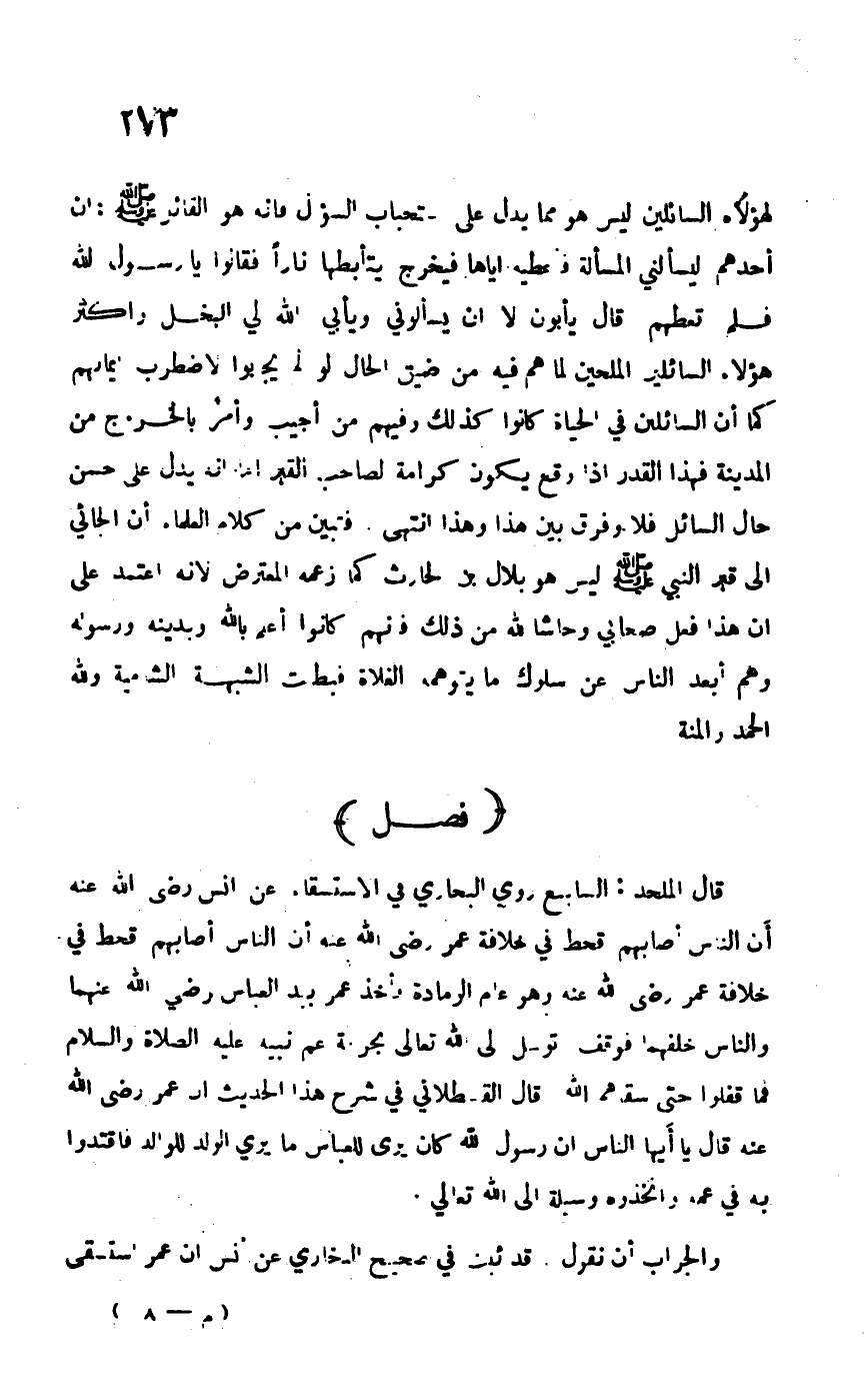 لهؤلاء السائلين ليس هو مما يدل على استحباب السؤال فإنه هو القائل –صلى الله عليه وسلم-: "إن أحدهم ليسألني المسألة فاعطيه إياها فيخرج يتأبطها ناراً" فقالوا يا رسول الله فلم تعطهم قال: "يأبون إلا أن يسألوني ويأبى الله لي البخل" وأكثر هؤلاء السائلين الملحين لما هم يه من ضيق الحال لو لم يجابوا لاضطرب إيمانهم كما أن السائلين في الحياة كانوا كذلك وفيهم من أجيب وأمر بالخروج من المدينة فهذا القدر إذا وقع يكون كرامة لصاحب القبر أما أنه يدل على حسن حال السائل فلا وفرق بين هذا وهذا. انتهى. فتبين من كلام العلماء أن الجائي إلى قبر النبي –صلى الله عليه وسلم- ليس هو بلال بن الحارث كما زعمه المعترض لأنه اعتمد على أن هذا فعل صحابي وحاشا لله من ذلك فإنهم كانوا أعلم بالله وبدينه ورسوله وهم أبعد الناس عن سلوك ما يتوهمه الغلاة فبطلت الشبهة الشامية ولله الحمد والمنة.