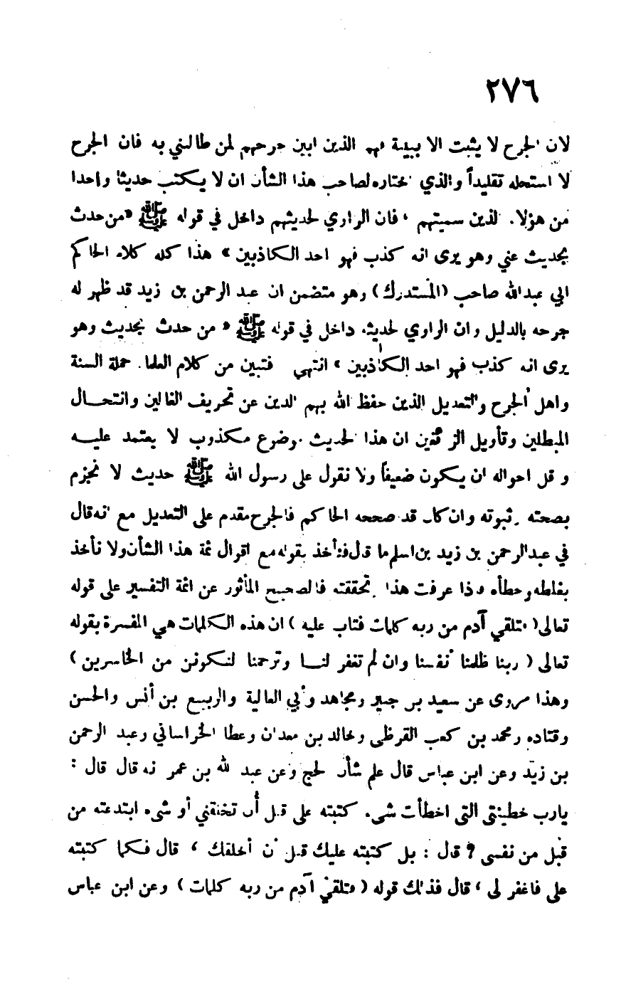 لأن الجرح لا يثبت إلا ببينة فهم الذين أبين جرحهم لمن طالبني به فأن الجرح لا أستحله تقليداً والذي اختاره لصاحب هذا الشأن أن لا يكتب حديثاً واحداً من هؤلاء الذين سميتهم فإن الراوي لحديثهم داخل في قوله –صلى الله عليه وسلم- "من حدث بحديث عني وهو يرى أنه كذب فهو أحد الكاذبين" هذا كله كلام الحاكم أبي عبد الله صاحب "المستدرك" وهو متضمن أن عبد الرحمن بن زيد قد ظهر له جرحه بالدليل وأن الراوي لحديثه داخل في قوله –صلى الله عليه وسلم- "من حدث بحديث وهو يرى أنه كذب فهو أحد الكاذبين" انتهى. فتبين من كلام العلماء حملة السنة وأهل الجرح والتعديل الذين حفظ الله بهم الدين عن تحريف الغالين وانتحال المبطلين وتأويل الزائغين أن هذا الحديث موضوع مكذوب لا يعتمد عليه وأقل أحواله أن يكون ضعيفاً ولا نقول على رسول الله –صلى الله عليه وسلم- حديث لا نجزم بصحته وثبوته وإن كان قد صححه الحاكم فالجرح مقدم على التعديل مع أنه قال في عبد الرحمن بن زيد بن أسلم ما قال فنأخذ بقوله مع أقوال أئمة هذا الشأن ولا نأخذ بغلطه وخطئه فإذا عرفت هذا وتحققته فالصحيح المأثور عن أئمة التفسير على قوله تعالى: {فَتَلَقَّى آدَمُ مِنْ رَبِّهِ كَلِمَاتٍ فَتَابَ عَلَيْهِ} أن هذه الكلمات هي المفسرة بقوله تعالى: {رَبَّنَا ظَلَمْنَا أَنْفُسَنَا وَإِنْ لَمْ تَغْفِرْ لَنَا وَتَرْحَمْنَا لَنَكُونَنَّ مِنْ الْخَاسِرِينَ} وهذا مروي عن سعيد بن جبير ومجاهد وأبي العالية والربيع بن أنس والحسن وقتادة ومحمد بن كعب القرظي وخالد بن معدان وعطاء الخراساني وعبد الرحمن بن زيد وعن ابن عباس قال علم شأن الحج وعن عبد الله بن عمر أنه قال: قال يا رب خطيئتي التي أخطأت شيء كتبته علي قبل أن تخلقني أو شيء ابتدعته من قبل نفسي؟ قال: بل كتبته عليك قبل أن أخلقك، قال فكما كتبته عليّ فاغفر لين قال فذلك قوله {فَتَلَقَّى آدَمُ مِنْ رَبِّهِ كَلِمَاتٍ} وعن ابن عباس