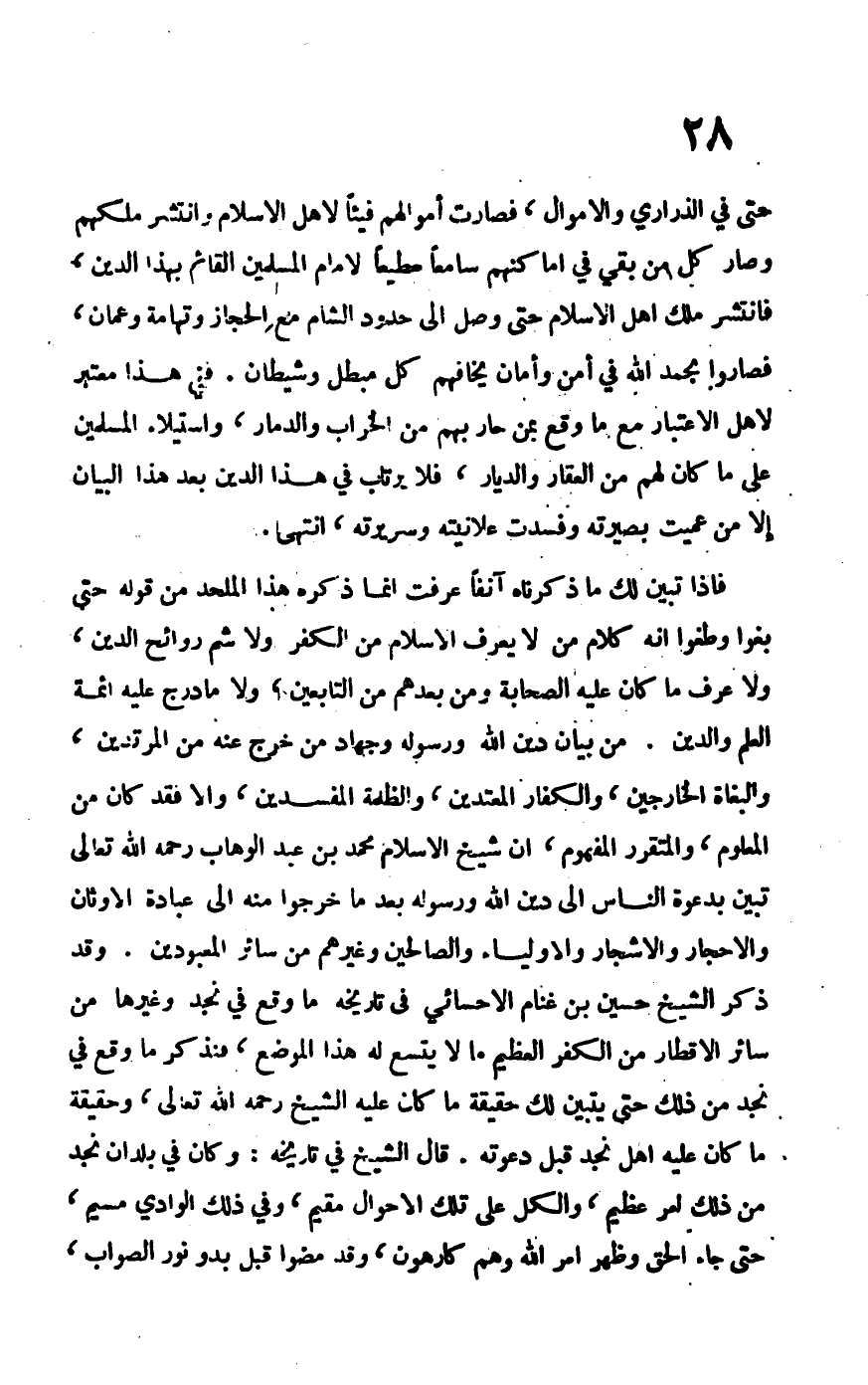 حتى في الذراري والأموال، فصارت أموالهم فيئاً لأهل الإسلام وانتشر مكلهم وصار كل من بقي في أماكنهم سامعاً مطيعاً لإمام المسلمين القائم بهذا الدين، فانتشر مالك أهل الإسلام حتى وصل إلى حدود الشام مع الحجاز وتهامة وعمان، فصاروا بحمد الله في أمن وأمان يخافهم كل مبطل وشيطان. ففي هذا معتبر لأهل الاعتبار مع ما وقع بمن حاربهم من الخراب والدمار، واستيلاء المسلمين على ما كان لهم من العقار والديار، فلا يرتاب في هذا الدين بعد هذا البيان إلا من عميت بصيرته وفسدت علانيته وسريته. انتهى.