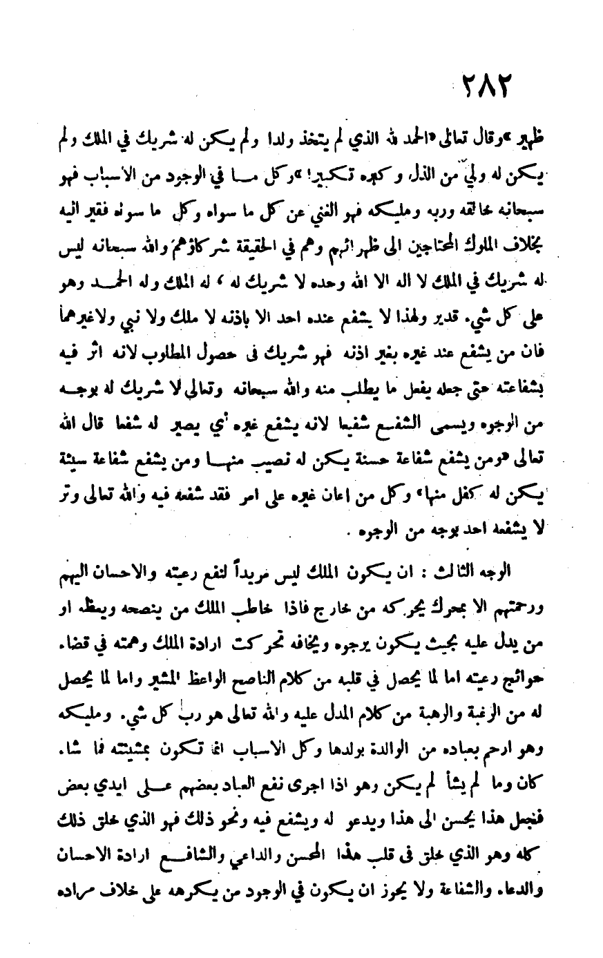 الوجه الثالث: أن يكون الملك ليس مريداً لنفع رعيته والإحسان إليه ورحمتهم إلا بمحرك يحركه من خارج فإذا خاطب الملك من ينصحه ويعظ أو من يدل عليه بحيث يكون يرجوه ويخافه تحركت إرادة الملك وهمته في قضاء حوائج رعيته إما لما يحصل في قلبه من كلام الناصح الواعظ المشير وإما لما يحصل له من الرغبة والرهبة من كلام المدلول عليه والله تعالى هو رب كل شيء ومليكه وهو أرحم بعباده من الوالدة بولدها وكل الأسباب إنما تكون بمشيئته فما شاء كان وما لم يشأ لم يكن وهو إذا أجرى نفع العباد بعضهم على أيدي بعض فنجعل هذا يحسن إلى هذا ويدعو له ويشفع فيه ونحو ذلك فهو الذي خلق ذلك كله وهو الذي خلق في قلب هذا المحسن والداعي والشافع إرادة الإحسان والدعاء والشفاعة ولا يجوز أن يكون في الوجود من يكرهه على خلاف مراده