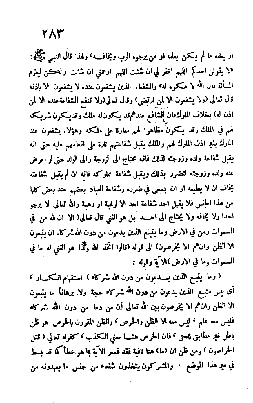 أو يعلمه ما لم يكن يعلمه أو من يرجوه الرب ويخافه، ولهذا قال النبي –صلى الله عليه وسلم-: "لا يقولن أحدكم اللهم اغفر لي إن شئت اللهم ارحمني إن شئت ولكن ليعزم المسألة فالله لا مكره له" والشفعاء الذين يشفعون عنده لا يشفعون إلا بإذنه قال تعالى: {وَلَا يَشْفَعُونَ إِلَّا لِمَنْ ارْتَضَ} وقال تعالى: {وَلَا تَنْفَعُ الْشَّفَاعَةُ عِنْدَهُ إِلَّا لِمَنْ أَذِنَ لَهُ} بخلاف الملوك فإن الشافع عندهم قد يكون له ملك وقد يكون شركه لهم في الملك وقد يكون مظاهراً لهم معاوناً على ملكه وهؤلاء يشفعون عند الملوك بغير إذن الملوك لهم والملك يقبل شفاعتهم تارة على إنعامهم عليه حتى إنه يقبل شفاعة ولده وزوجته لذلك فإنه محتاج إلى الزوجة وإلى الولد حتى لو أعرض عنه ولده وزوجته لتضرر بذلك ويقبل شفاعة مملوكه فإنه إن لم يقبل شفاعته يخاف أن لا يطيعه أو أن يسعى في ضرره وشفاعة العبادة بعضهم عند بع كلها من هذا الجنس فلا يقبل أحد شفاعة أحد إلا لرغبة أو رهبة والله تعالى لا يرجو أحداً ولا يخافه ولا يحتاج إلى أحد بل هو الغني قال تعالى: {أَلَا إِنَّ لِلهِ مَنْ فِي الْسَّمَاوَاتِ وَمَنْ فِي الْأَرْضِ وَمَا يَتَّبِعُ الَّذِينَ يَدْعُونَ مِنْ دُونِ اللهِ شُرَكَاءَ إِنْ يَتَّبِعُونَ إِلَّا الْظَّنَّ وَإِنْ هُمْ إِلَّا يَخْرُصُونَ} إلى قوله: {قَالُوا اتَّخَذَ اللَّهُ وَلَداً سُبْحَانَهُ هُوَ الْغَنِيُّ لَهُ مَا فِي السَّمَاوَاتِ وَمَا فِي الْأَرْضِ} الآية وقوله: