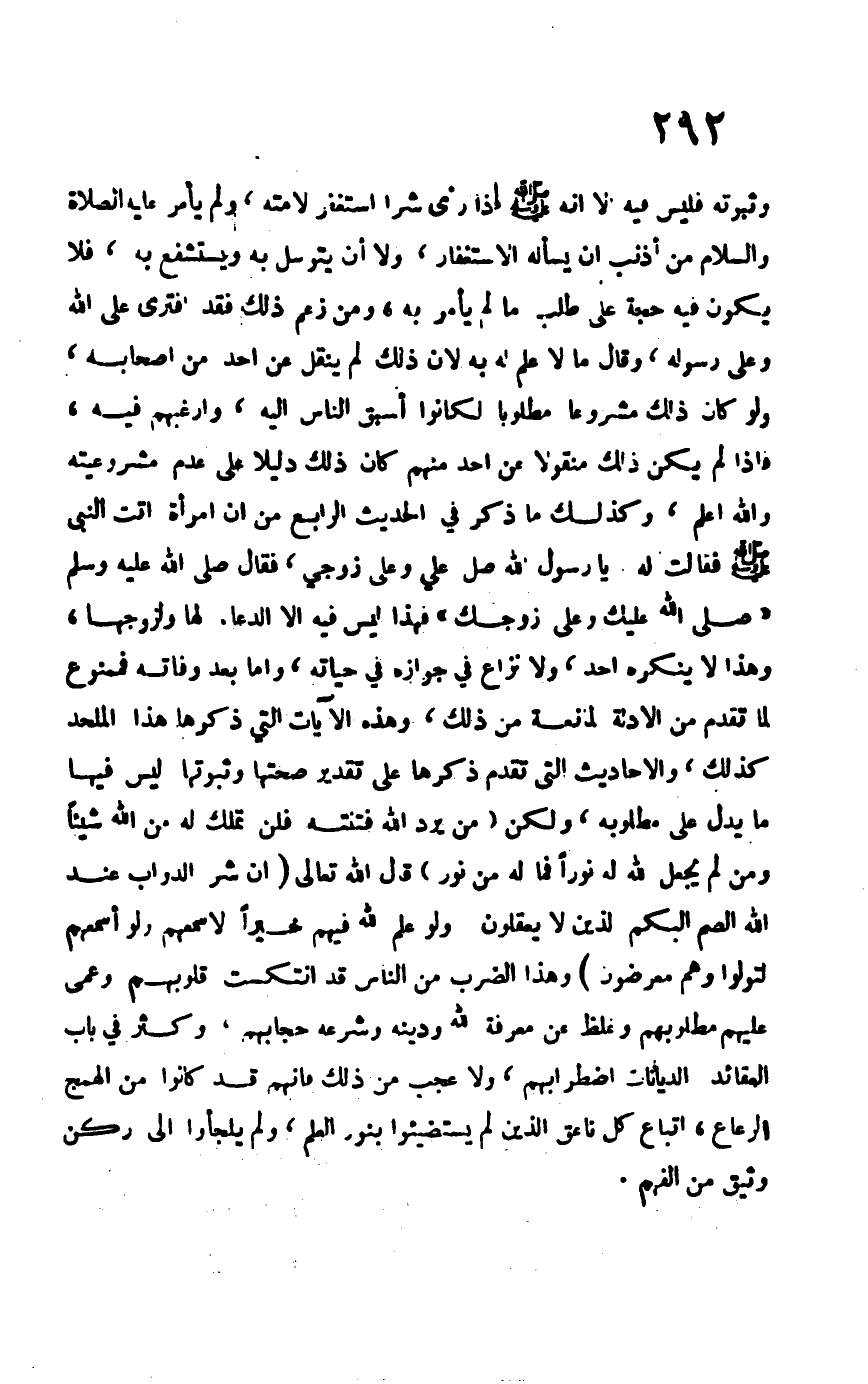 وثبوته فليس فيه إلا أنه –صلى الله عليه وسلم- إذا رأى شراً استغفر لأمته، ولم يأمر –عليه الصلاة والسلام- من أذنب أن يسأله الاستغفار، ولا أن يتوسل به ويستشفع به، فلا يكون فيه حجة على طلب ما لم يأمر به، ومن زعم ذلك فقد افترى على الله وعلى رسوله، وقال ما لا علم له به لأن ذلك لم ينقل عن أحد من أصحابه، ولو كان ذلك مشروعاً مطلوباً لكانوا أسبق النار إليه، وأرغبهم فيه، وإذا لم يكن ذلك منقولاً عن أحد منهم كان ذلك دليلاً على عدم مشروعيته والله أعلم، وكذلك ما ذكر في الحديث الرابع من أن امرأة أتت النبي –صلى الله عليه وسلم- فقال له يا رسول الله صل عليّ وعلى زوجي، فقال –صلى الله عليه وسلم-: "صلى الله عليك وعلى زوجك" فهذا ليس فيه إلا الدعاء، لها ولزوجها، وهذا لا ينكره أحد، ولا نزاع في جوازه في حياته، وأما بعد وفاته فممنوع لما تقدم من الأدلة المانعة من ذلك، وهذه الآيات التي ذكرها هذا الملحد كذلك، والأحاديث التي تقدم ذكرها على تقدير صحتها وثبوتها ليس فيها ما يدل على مطلوبه، ولكن من يرد الله فتنته فلن تملك من الله شيئاً ومن لم يجعل الله له نوراً فما له من نور, قال الله تعالى: {إِنَّ شَرَّ الدَّوَابِّ عِنْدَ اللَّهِ الصُّمُّ الْبُكْمُ الَّذِينَ لا يَعْقِلُونَ , وَلَوْ عَلِمَ اللَّهُ فِيهِمْ خَيْراً لَأسْمَعَهُمْ وَلَوْ أَسْمَعَهُمْ لَتَوَلَّوْا وَهُمْ مُعْرِضُونَ} وهذا الضرب من الناس قد انتكست قلوبهم وعمي عليهم مطلوبهم وغلظ من معرفة الله ودينه وشرعه حجابهم، وكثر في باب العقائد الديانات اضطرابهم، ولا عجب من ذلك فإنهم قد كانوا من الهمج الرعاع، اتباع كل ناعق لم يستضيئوا بنور العلم، ولم يلجأوا إلى ركن وثيق من الفهم.