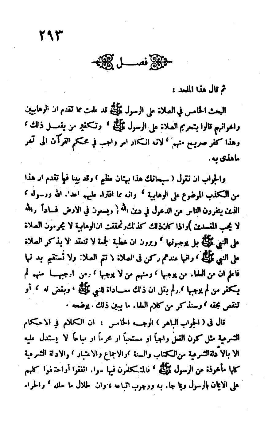 البحث الخامس في الصلاة على الرسول –صلى الله عليه وسلم- قد علمت مما تقدم أن الوهابيين وإخوانهم قالوا بتحريم الصلاة على الرسول –صلى الله عليه وسلم-، وتكفير من يفعل ذلك، وهذا كفر صريح منهم، لأنه إنكار أمر واجب في محكم القرآن إلى آخر ما هذي به.