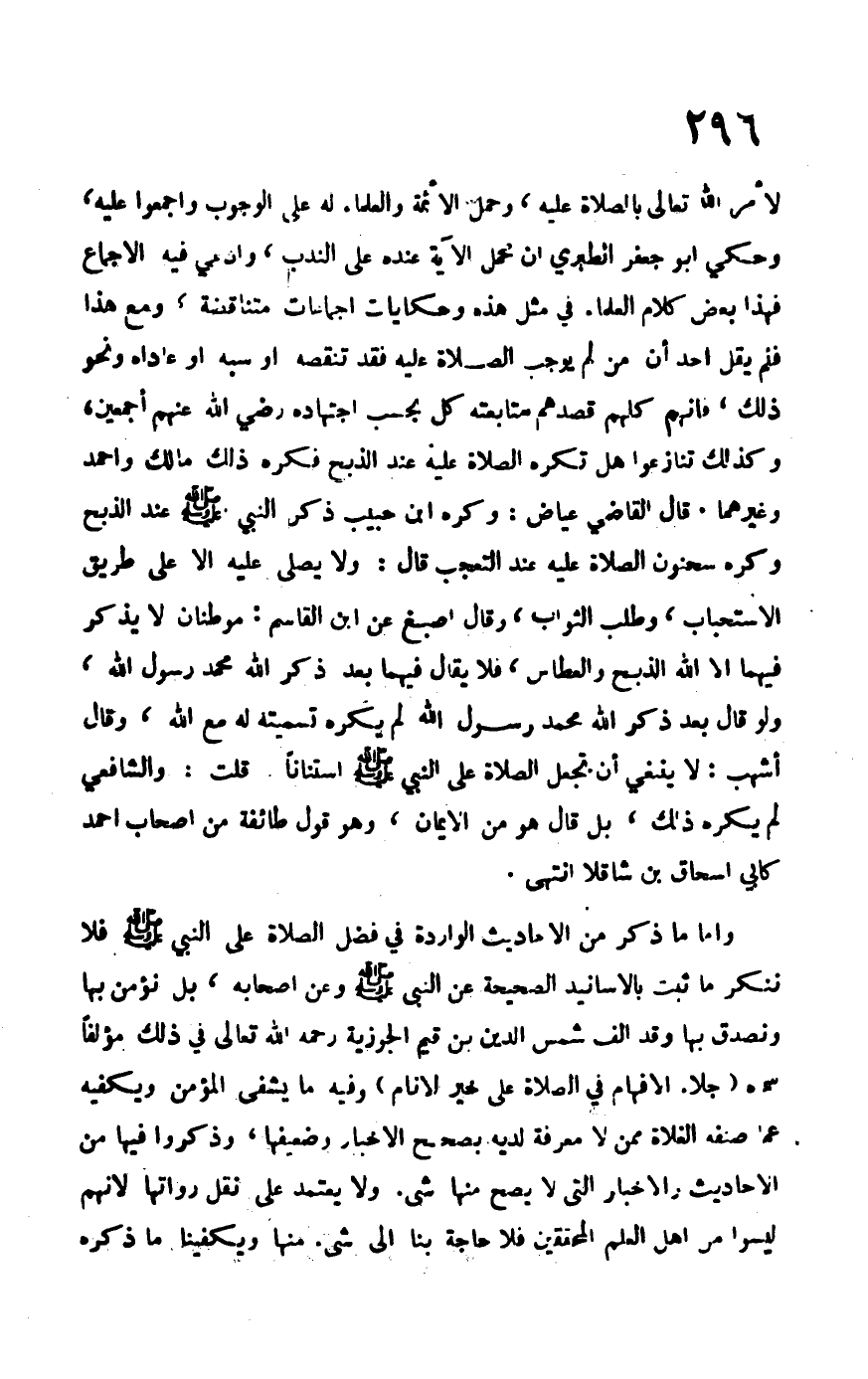 لأمر الله تعالى بالصلاة عليه، وحمل الأئمة والعلماء له على الوجوب وأجمعوا عليه، وحكى أبو جعفر الطبري أن محمل الآية عنده على الندب، وادعي فيه الإجماع فهذا بعض كلام العلماء في مثل هذه وحكايات إجماعات متناقضة، ومع هذا فلم يقل أحد أن من لم يوجب الصلاة عليه فقد تنقصه أو سبه أو عاداه ونحو ذلك، فإنهم كلهم قصدهم متابعته كل بحسب اجتهاده –رضي الله عنهم أجمعين-، وكذلك تنازعوا هل تكره الصلاة عليه عند الذبح فكره ذلك ما لك وأحمد وغيرهما. قال القاضي عياض: وكره ابن حبيب ذكر النبي –صلى الله عليه وسلم- إلا على طريق وكره سحنون الصلاة عليه عند التعجب قال: ولا يصلى عليه إلا على طريق الاستحباب، وطلب الثواب، وقال أصبغ عن ابن القاسم: موطنان لا يذكر لا يذكر فيهما إلا الله الذبح والعطاس، فلا يقال فيهما بعد ذكر الله محمد رسول الله، ولو قال بعد ذكر الله محمد رسول الله لم يكره تسميته له مع الله، وقال أشهب: لا ينبغي أن تجعل الصلاة على النبي –صلى الله عليه وسلم- استناناً قلت: والشافعي لم يكره ذلك، بل قال هو من الإيمان، وهو قول طائفة من أحاب أحمد كأبي إسحاق بن شاقلا. انتهى.