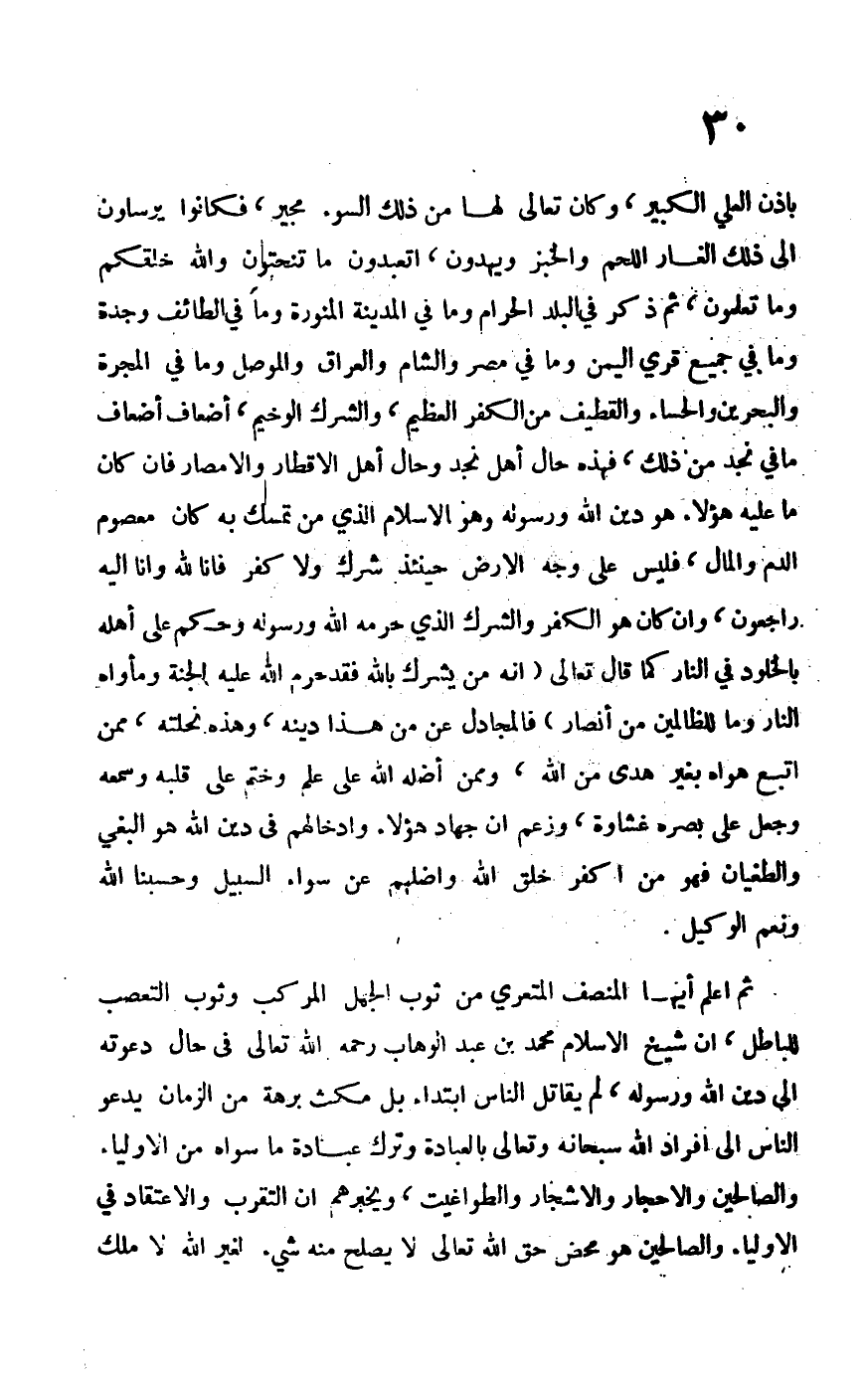 بإذن العلي الكبير، وكان تعالى لها من ذلك السوء مجير، فكانوا يرسلون إلى ذلك الغار اللحم والخبز ويهدون، أتعبدون ما تنحتون والله خلقكم وما تعملون، ثم ذكر في البلد الحرام وما في المدينة المنورة وما في الطائف وجدة وما في جميع قرى اليمن وما في مصر والشام والعراق والموصل وما في المجرة والبحرين والحساء والقطيف من الكفر العظيم، والشرك الوخيم، أضعاف أضعاف ما في نجد من ذلك، فهذه حال أهل نجد وحال أهل الأقطار والأمصار فإن كان ما عليه هؤلاء هو دين الله ورسوله وهو الإسلام الذي تمسك به كان معصوم الدم والمال، فليس على وجه الأرض حينئذٍ شرك ولا كفر فإنا لله وإنا إليه راجعون، وإن كان هو الكفر والشرك الذي حرمه الله ورسوله وحكم على أهله بالخلود في النار كما قال تعالى: {إِنَّهُ مَنْ يُشْرِكْ بِاللَّهِ فَقَدْ حَرَّمَ اللَّهُ عَلَيْهِ الْجَنَّةَ وَمَأْوَاهُ النَّارُ وَمَا لِلظَّالِمِينَ مِنْ أَنْصَارٍ} فالمجادل عن هذا دينه، وهذه نحلته، ممن اتبع هواه بغير هدى من الله، وممن أضله على علم وختم على قلبه وسمعه وجعل على بصره غشاوة، وزعم أن جهاد هؤلاء وإدخالهم في دين الله هو البغي والطغيان فهو من أكفر خلق الله وأضلهم عن سواء السبيل وحسبنا الله ونعم الوكيل.