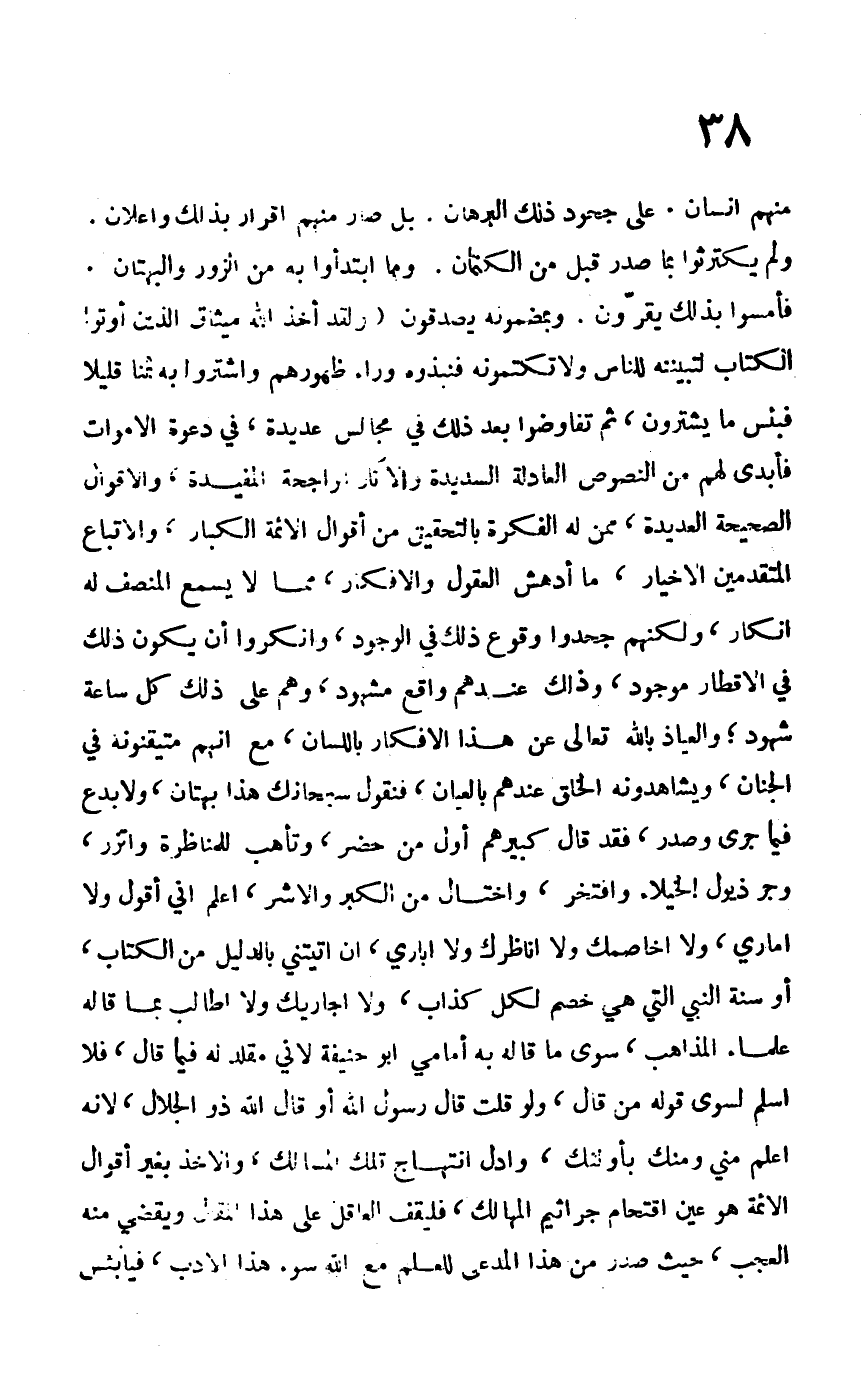 منهم إنسان على جحود ذلك البرهان، بل صدر منهم إقرار بذلك وإعلان ولم يكترثوا بما صدر قبل من الكتمان وما ابتدأوا به من الزور والبهتان فأمسوا بذلك يقرون وبمضمونه يصدقون {وَإِذْ أَخَذَ اللَّهُ مِيثَاقَ الَّذِينَ أُوتُوا الْكِتَابَ لَتُبَيِّنُنَّهُ لِلنَّاسِ وَلا تَكْتُمُونَهُ فَنَبَذُوهُ وَرَاءَ ظُهُورِهِمْ وَاشْتَرَوْا بِهِ ثَمَناً قَلِيلاً فَبِئْسَ مَا يَشْتَرُونَ} ثم تفاوضوا بعد ذلك في مجالس عديدة، في دعوة الأموات فأبدى لهم من النصوص العادلة السديدة والآثار الراجحة المفيدة، والأقوال الصحيحة العديدة، ممن له الفكرة بالتحقيق من أقوال الأئمة الكبار، والاتباع المتقدمين الأخيار، ما أدهش العقول والأفكار، مما لا يسمع له إنكار، ولكنهم جحدوا وقوع ذلك في الوجود، وأنكروا أن يكون ذلك في الأقطار موجود وذلك عندهم واقع مشهود، وهم على ذلك كل ساعة شهود، والعياذ بالله تعالى عن هذه الأفكار باللسان، مع أنهم متيقنونه في الجنان، ويشاهدونه الخلق عندهم بالأعيان، فنقول سبحانك هذا بهتان، ولا بدع فيما جرى وصدر، فقد قال كبيرهم أول من حضر، وتأهب للمناظرة واتزر، وجر ذيول الخيلاء وافتخر، واختال من الكبر والأشر، اعلم أني أقول ولا أماري، ولا أخاصمك ولا أناظرك، ولا أباري، أن تأتيني بالدليل من الكتاب، أو سنة النبي التي هي خصم لكل كذاب، ولا أجاريك ولا أطالب بما قاله علماء المذاهب، سوى ما قاله به إمامي أبو حنيفة لأني مقلد له فيما قال فلا أسلم لسوى قوله من قال، ولو قلت قال رسول الله أو قال الله ذو الجلال، لأنه أعلم مني ومنك بأولئك، وأدل انتهاج تلك المسالك، والأخذ بغير أقوال الأئمة هو عين اقتحام جراثيم المهالك، فليقف العاقل على هذا المقال ويقضي منه العجب، حيث صدر من هذا المدعي للعلم مع الله سوء هذا الأدب، فيا بئس