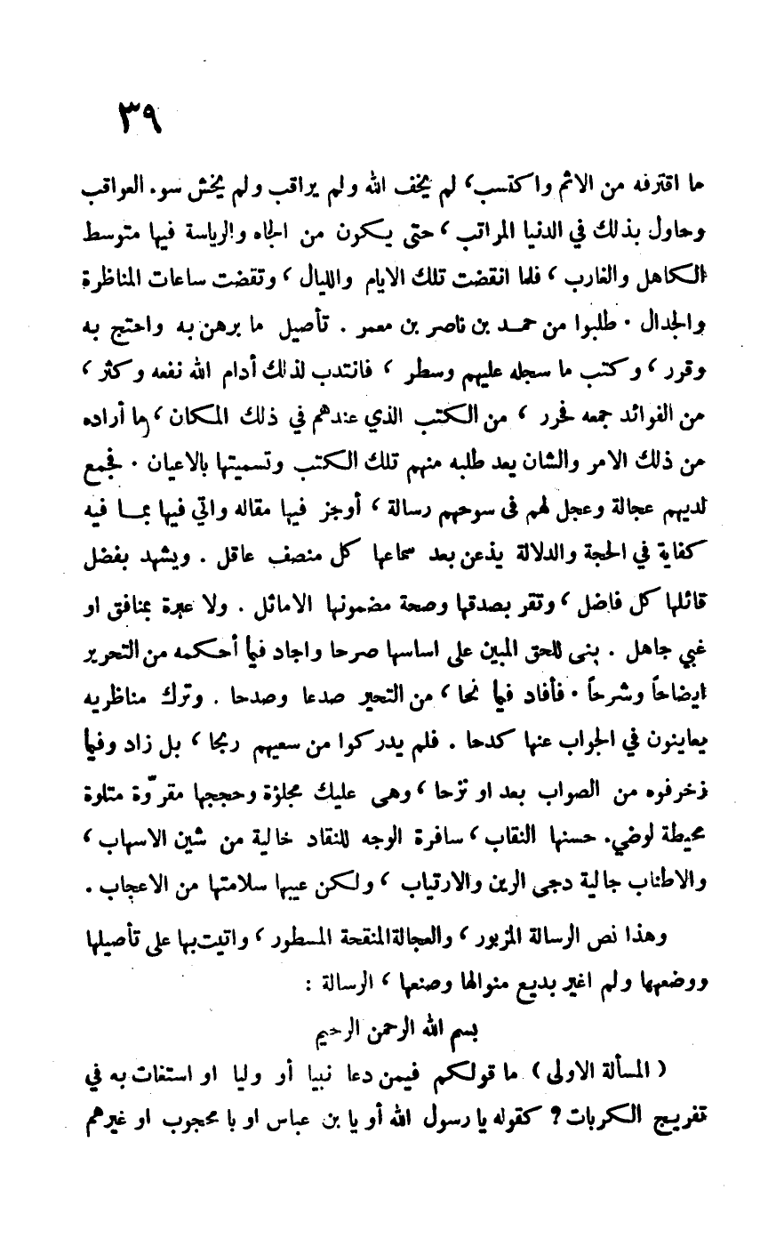 وهذا نص الرسالة المزبور، والعجالة المنقحة المسطور، وأتيت بها على تأصيلها ووضعها ولم أغير بديع منوالها وصنعها، الرسالة.