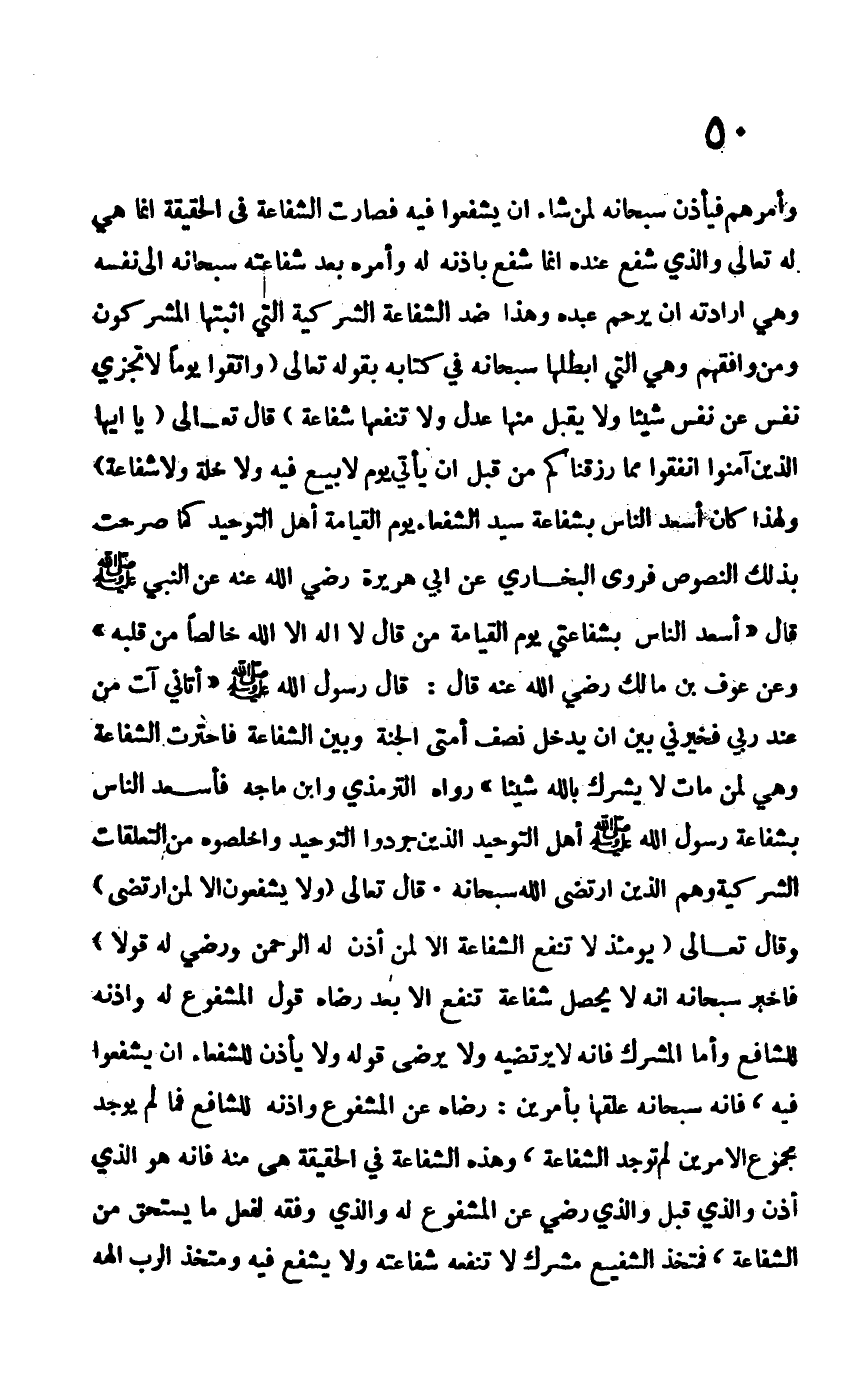 وأمرهم فيأذن سبحانه لمن شاء أن يشفعوا فيه فصارت الشفاعة في الحقيقة إنما هي له تعالى والذي شفع عنده إنما شفع بإذنه له وأمره بعد شفاعته سبحانه إلى نفسه وهي إرادته أن يرحم عبده وهذا ضد الشافعة الشركية التي أثبتها المشركون ومن وافقهم وهي التي أبطلها سبحانه في كتابه بقوله تعالى: {وَاتَّقُوا يَوْماً لا تَجْزِي نَفْسٌ عَنْ نَفْسٍ شَيْئاً وَلا يُقْبَلُ مِنْهَا شَفَاعَةٌ} قال تعالى: {يَا أَيُّهَا الَّذِينَ آمَنُوا أَنْفِقُوا مِمَّا رَزَقْنَاكُمْ مِنْ قَبْلِ أَنْ يَأْتِيَ يَوْمٌ لا بَيْعٌ فِيهِ وَلا خُلَّةٌ وَلا شَفَاعَةٌ} ولهذا كان أسعد الناس بشفاعة سيد الشفعاء يوم القيامة أهل التوحيد كما صرحت بذلك النصوص فروى البخاري عن أبي هريرة –رضي الله عنه- عن النبي –صلى الله عليه وسلم- قال: "أسعد الناس بشفاعتي يوم القيامة من قال لا إله إلا الله خالصاً من قلبه"، وعن عوف بن مالك –رضي الله عنه- قال: قال رسول الله –صلى الله عليه وسلم-: "أتاني آت من عند ربي فخيرني بين أن يدخل نصف أمتي الجنة وبين الشفاعة فاخترت الشفاعة وهي لمن مات لا يشرك بالله شيئاً" رواه الترمذي وابن ماجه فأسعد الناس بشفاعة رسول الله –صلى الله عليه وسلم- أهل التوحيد الذين جردوا التوحيد وأخلصوه من التعلقات الشركية وهم الذين ارتضى الله سبحانه. قال تعالى: {وَلا يَشْفَعُونَ إِلَّا لِمَنِ ارْتَضَى} وقال تعالى: {يَوْمَئِذٍ لا تَنْفَعُ الشَّفَاعَةُ إِلَّا مَنْ أَذِنَ لَهُ الرَّحْمَنُ وَرَضِيَ لَهُ قَوْلاً} فأخبر سبحانه أنه لا يحصل شفاعة تنفع إلا بعد رضاه قول المشفوع له وإذنه للشافع وأما المشرك فإنه لا يرتضيه ولا يرضى قوله ولا يأذن للشفعاء أن يشفعوا فيه، فإنه سبحانه علقها بأمرين: رضاه عن المشفوع وإذنه للشافع فما لم يوجد مجموع الأمرين لم توجد الشفاعة، وهذه الشفاعة في الحقيقة هي منه فإنه هو الذي أذن والذي قبل والذي رضي عن المشفوع له والذي وفقه لفعل ما يستحق من الشفاعة، فمتخذ الشفيع مشرك لا تنفعه شفاعته ولا يشفع فيه ومتخذ الرب إلهه