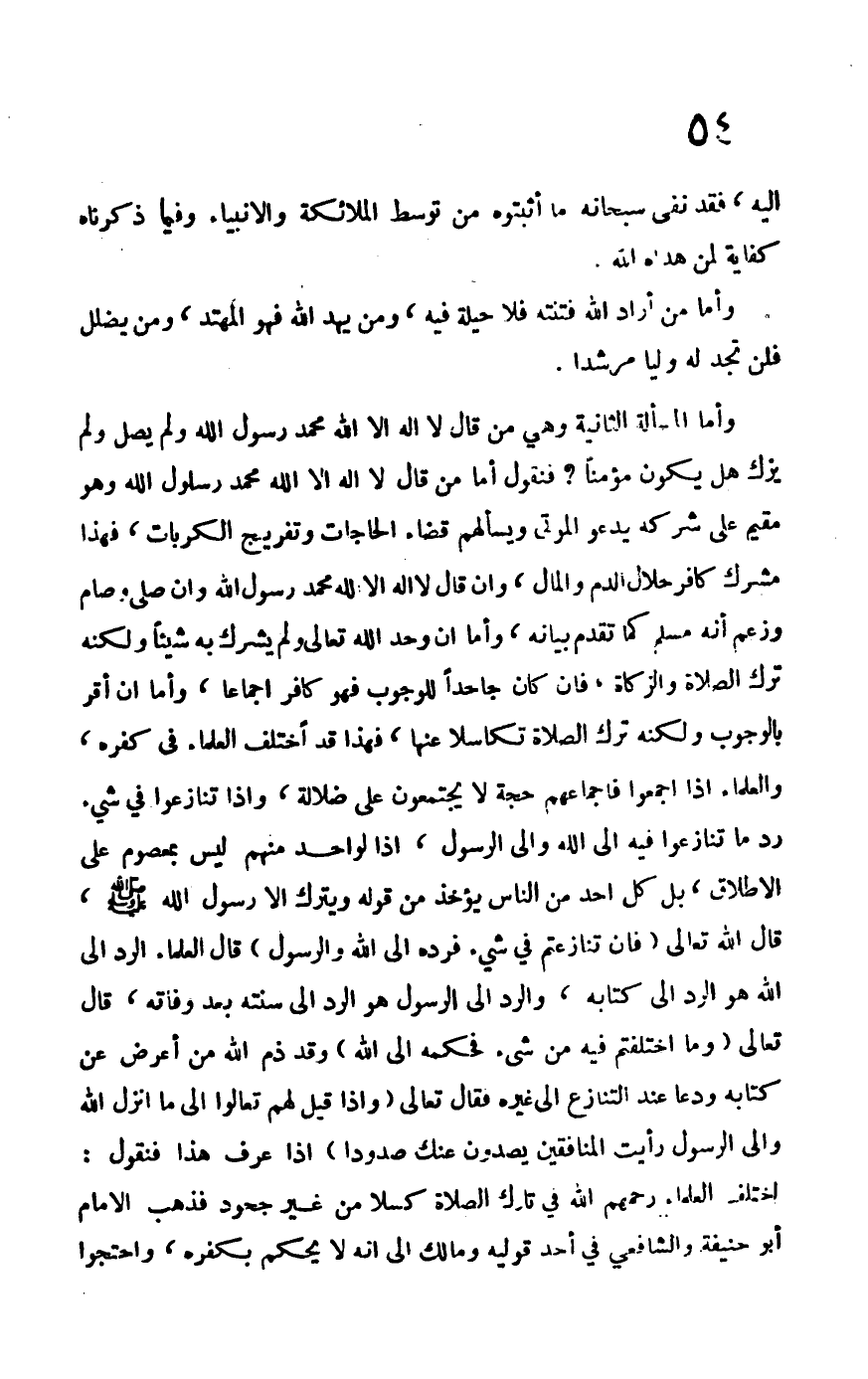 وأما المسألة الثانية وهي من قال لا إله إلا الله محمد رسول الله ولم يصل ولم يزك هل يكون مؤمناً؟ فنقول أما من قال لا إله إلا الله محمد رسول وهو مقيم على شركه يدعو الموتى ويسألهم قضاء الحاجات وتفريج الكربات، فهذا مشرك كافر حلال الدم والمال، وإن قال لا إله إلا الله محمد رسول الله وإن صلى وصام وزعم أنه مسلم كما تقدم بيانه، وأما إن وحد الله تعالى ولم يشرك به شيئا ولكن ترك الصلاة والزكاة، فإن كان جاحداً للوجوب فهو كافر إجماعاً، وأما إن أقر بالوجوب ولكنه ترك الصلاة تكاسلاً عنها، فهذا اختلف العلماء في كفره، والعلماء إذا أجمعوا فإجماعهم حجة لا يجتمعوا على ضلالة، وإذاتنازعوا في شيء رد ما تنازعوا فيه إلى الله وإلى الرسول، إذ الواحد منهم ليس بمعصوم على الإطلاق، بل كل أحد من الناس يؤخذ من قوله ويترك إلى رسول الله –صلى الله عليه وسلم- قال الله تعالى: {فَإِنْ تَنَازَعْتُمْ فِي شَيْءٍ فَرُدُّوهُ إِلَى اللَّهِ وَالرَّسُولِ} قال العلماء الرد إلى الله هو الرد إلى كتابه، والرد إلى الرسول هو إلى سنته بعد وفاته قال تعالى: {وَمَا اخْتَلَفْتُمْ فِيهِ مِنْ شَيْءٍ فَحُكْمُهُ إِلَى اللَّهِ} وقد ذم الله من أعرض عن كتابه ودعا عند التنازع إلى غيره فقال تعالى: {وَإِذَا قِيلَ لَهُمْ تَعَالَوْا إِلَى مَا أَنْزَلَ اللَّهُ وَإِلَى الرَّسُولِ رَأَيْتَ الْمُنَافِقِينَ يَصُدُّونَ عَنْكَ صُدُوداً} إذا عرف هذا فنقول: اختلف العلماء –رحمهم الله- في تارك الصلاة كسلاً من غير جحود فذهب أبو حنيفة والشافعي في أحد قوليه ومالك إلى أنه لا يحكم بكفره، واحتجوا