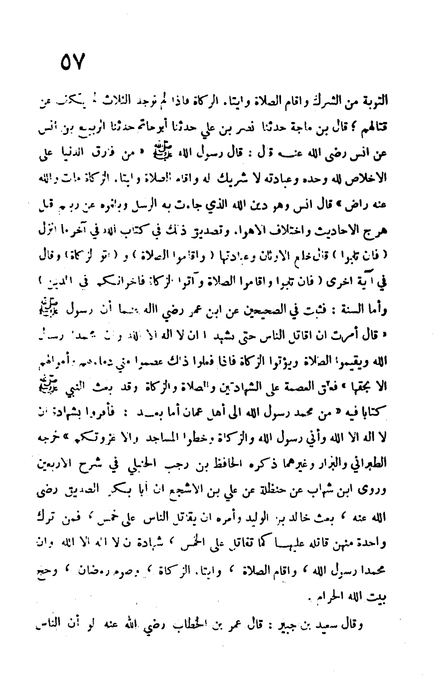 التوبة من الشرك وإقام الصلاة وإيتاء الزكاة، فإذا لم توجد الصلاة لم يكف عن قتالهم؛ قال ابن ماجه حدثنا نصر بن علي، حدثنا أبو حاتم، حدثنا الربيع بن أنس، عن أنس –رضي الله عنه- قال: قال رسول الله –صلى الله عليه وسلم-: "من فارق الدنيا على الإخلاص لله وحده وعبادته لا شريك له وإقام الصلاة وإيتاء الزكاة مات والله عنه راض" قال أنس وهو دين الله الذي جاءت به الرسل وبلغوه عن ربهم قبل هرج الأحاديث واختلاف الأهواء وتصديق ذلك في كتاب الله في آخر ما نزل {فَإِنْ تَابُوا} قال خلع الأوثان وعبادتها {وَأَقَامُوا الصَّلاةَ} و {وَآتَوُا الزَّكَاةَ} وقال في آية أخرى: {فَإِنْ تَابُوا وَأَقَامُوا الصَّلاةَ وَآتَوُا الزَّكَاةَ فَإِخْوَانُكُمْ فِي الدِّينِ} وأما السنة فثبت في الصحيحين عن ابن عمر –رضي الله عنهما- أن رسول الله –صلى الله عليه وسلم- قال: "أمرت أن أقاتل الناس حتى يشهدوا أن لا إله إلا الله وأن محمداً رسول الله ويقيموا الصلاة ويؤتوا الزكاة فإذا فعلوا ذلك عصموا مني دماءهم وأموالهم إلا بحقها" فعلق العصمة على الشهادتين والصلاة والزكاة وقد بعث النبي –صلى الله عليه وسلم- كتاباً فيه: "من محمد رسول الله إلى أهل عمان أما بعد: فأقروا بشهادة أن لا إله إلا الله وأني رسول الله والزكاة وخطوا المساجد وإلا غزوتكم" خرجه الطبراني والبزار وغيرهما ذكره الحافظ ابن رجب الحنبلي في شرح الأربعين، وروى ابن شهاب عن حنظلة عن علي بن الأشجع أن أبا بكر الصديق –رضي الله عنه- بعث خالد بن الوليد وأمره أن يقاتل الناس على خمس، فمن ترك واحدة منهن قاتله عليها كما تقتل على الخمس، شهادة أن لا إله إلا الله وأن محمداً رسول الله، وإقام الصلاة، وإيتاء الزكاة، وصوم رمضان، وحج بيت الله الحرام.