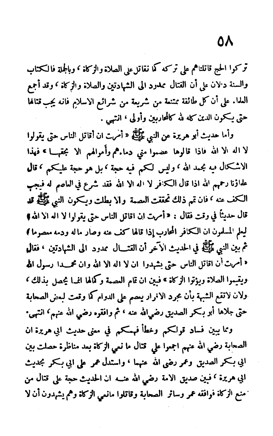 ومما يبين فساد قولكم وخطأ فهمكم في معنى حديث أبي هريرة أن الصحابة –رضي الله عنهم- أجمعوا على قتال مانعي الزكاة بعد مناظرة حصلت بين أبي بكر الصديق وعمر –رضي الله عنهما-، واستدل على أبي كب بحديث أبي هريرة، فبين صديق الأمة –رضي الله عنه- أن الحديث حجة على قتال من منع الزكاة فوافقه عمر وسائر الصحابة وقاتلوا مانعي الزكاة وهم يشهدون أن لا
