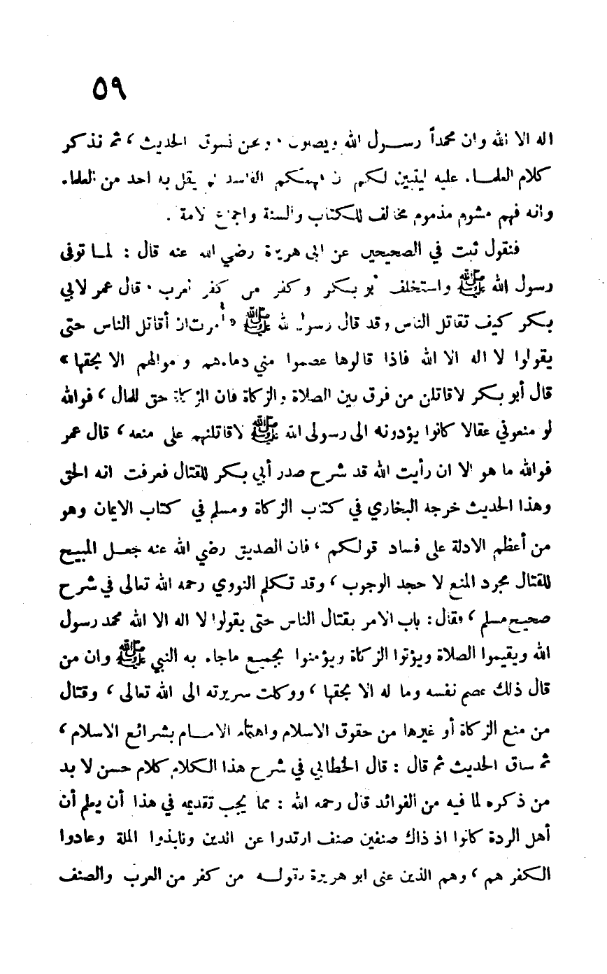 فنقول ثبت في الصحيحين عن أبي هريرة –رضي الله عنه- قال: لما توفي رسول الله –صلى الله عليه وسلم- واستخلف أبو بكر وكفر من كفر من العرب قال عمر لأبي بكر كيف تقاتل الناس وقد قال رسول الله –صلى الله عليه وسلم-: "أمرت أن أقاتل الناس حتى يقولوا لا إله إلا الله فإذا قالوها عصموا مني دماءهم وأموالهم إلا بحقها" فقال أبو بكر: لأقاتلن من فرق بين الصلاة والزكاة فإن الزكاة حق للمال، فوالله لو منعوني عقالاً كانوا يؤدونه إلى رسول الله –صلى الله عليه وسلم- لأقاتلهم على منعه، قال عمر فوالله ما هو إلا أن رأيت الله شرح صدر أبي بكر للقتال فعرفت أنه الحق، وهذا الحديث خرجه البخاري في كتاب الزكاة ومسلم في كتاب الإيمان وهو من أعظم الأدلة على فساد قولكم، فغن الصديق –رضي الله عنه- جعل المبيح للقتال مجرد المنع لا جحد الوجوب، وقد تكلم النووي –رحمه الله تعالى- في شرح صحيح مسلم، فقال: باب الأمر بقتال الناس حتى يقولوا لا إله إلا الله محمد رسول الله ويقيموا الصلاة ويؤتوا الزكاة ويؤمنوا بجميع ما جاء به النبي –صلى الله عليه وسلم- وأن من قال ذلك عصم نفسه وماله إلا بحقها، ووكلت سريرته إلى الله تعالى، وقتال من منع الزكاة أو غيرها من حقوق الإسلام واهتمام الإمام بشرائع الإسلام، ثم ساق الحديث ثم قال: قال الخطابي في شرح هذا الكلام كلام حسن لا بد من ذكره لما فيه من الفوائد قال –رحمه الله-: مما يجب تقديمه في هذا أن يعلم أن أهل الردة كانوا إذ ذاك صنفين صنف ارتدوا عن الدين ونابذوا الملة وعادوا إلى الكفر هم، وهم الذين عنى أبو هريرة بقوله من كفر من العرب والصنف