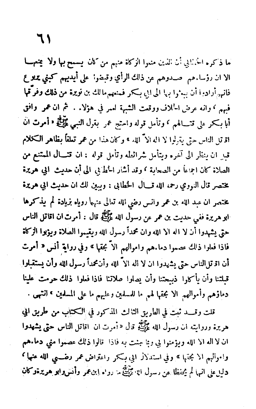 ما ذكره الخطابي أن الذين منعوا الزكاة منهم من كان يسمح بها ولا يمنعها إلا أن رؤساءهم صدوهم عن ذلك الرأي وقبضوا على أيديهم كبني يربوع فإنهم أرادوا أن يبعثوا بها إلى أبي بكر فمنعهم مالك بن نويرة من ذلك وفرقها فيهم، وأنه عرض الخلاف ووقعت الشبهة لعمر في هؤلاء، ثم أن غمر وافق أبا بكر على قتالهم، وتأمل قوله واحتج عمر بقول النبي –صلى الله عليه وسلم-: "أمرت أن أقاتل الناس حتى يقولوا لا إله إلا الله" وكان هذا من عمر تعلقاً بظاهر الكلام قبل أن ينظر إلى آخره ويتأمل شرائطه، وتأمل قوله: إن قتال الممتنع من الصلاة كان إجماعاً من الصحابة، وقد أشار الخطابي إلى أن حديث أبي هريرة مختصر. قال النووي –رحمه الله- قال الخطابي: ويبين لك أن حديث أبي هريرة مختصر أن عبد الله بن عمر وأنس –رضي الله تعالى عنهما- روياه بزيادة لم يذكرها أبو هريرة ففي حديث ابن عمر عن رسول الله –صلى الله عليه وسلم-قال: "أمرت أن أقاتل الناس حتى يشهدوا أن لا إله إلا الله وأن محمداً رسول الله ويقيموا الصلاة ويؤتوا الزكاة فإذا فعلوا ذلك عصموا دماءهم وأموالهم إلا بحقها" وفي رواية أنس "أمرت أن أقاتل الناس حتى يشهدوا أن لا إله إلا الله وأن محمداً رسول الله وأن يستقبلوا قبلتنا وأن يأكلوا ذبيحتنا وأن يصلوا صلاتنا فإذا فعلوا ذلك حرمت علينا دماؤهم وأموالهم إلا بحقها لهم ما للمسلمين وعليهم ما على المسلمين" انتهى.