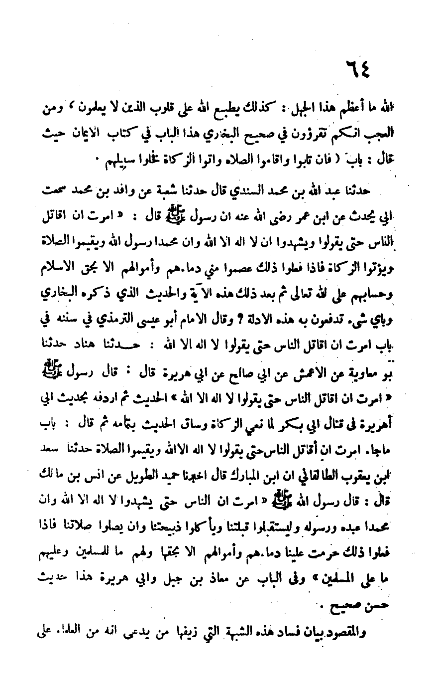 حدثنا عبد الله بن محمد السندي قال: حدثنا شعبة عن وافد بن محمد سمعت أبي يحدث عن ابن عمر –رضي الله عنه- أن رسول الله –صلى الله عليه وسلم- قال: "أمرت أن أقاتل الناس حتى يقولوا ويشهدوا أن لا إله إلا الله وأن محمداً رسول الله ويقيموا الصلاة ويؤتوا الزكاة فإذا فعلوا ذلك عصموا مني دماءهم وأموالهم إلا بحق الإسلام وحسابهم على الله تعالى" ثم بعد ذلك هذه الآية والحديث الذي ذكره البخاري وبأي شيء تدفعون به هذه الأدلة؟ وقال الإمام أبو عيسى الترمذي في سننه باب أمرت أن أقاتل الناس حتى يقولوا لا إله إلا الله: حدثنا هناد، حدثنا أبو معاوية، عن الأعمش، عن أبي صالح عن أبي هريرة قال: قال رسول الله –صلى الله عليه وسلم-: "أمرت أن أقاتل الناس حتى يقولوا ويشهدوا أن لا إله إلا الله" الحديث ثم أردفه بحدث أبي هريرة في قتال أبي بكر لمانعي الزكاة وساق الحديث بتمامه ثم قال: باب ما جاء أمرت أن أقاتل الناس حتى يقولوا لا إله إلا الله ويقيموا الصلاة، حدثنا بعد بن يعقوب الطالقاني أن ابن المبارك قال: أخبرنا حميد الطويل عن أنس بن مالك قال: قال رسول الله –صلى الله عليه وسلم-: "أمرت أن أقاتل الناس حتى يقولوا ويشهدوا أن لا إله إلا الله وأن محمداً رسول الله وليستقبلوا قبلتنا ويأكلوا ذبيحتنا وأن يصلوا صلاتنا فإذا فعلوا ذلك حرمت علينا دماءهم وأموالهم إلا بحقها ولهم ما للمسلمين وعليهم ما على المسلمين"، وفي الباب عن معاذ بن جبل وأبي هريرة هذا حديث حسن صحيح.