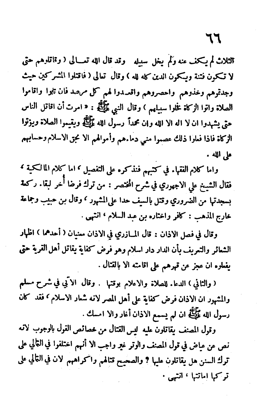 وقال في فصل الأذان: قال المازري في الأذان معنيان: "أحدهما" إظهار الشعائر والتعريف بأن الدار دار إسلام وهو فرض كفاية يقاتل أهل القرية حتى يفعلوه إن عجز عن قهرهم على إقامته إلا بالقتال.