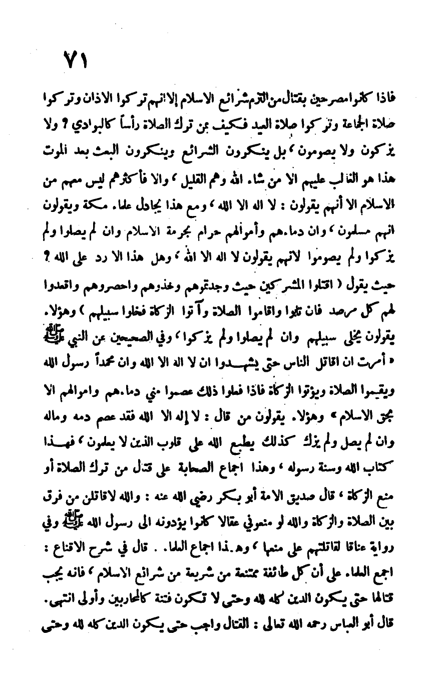 فإذا كانوا مصرحين بقتال من التزم شرائع الإسلام إلا أنهم تركوا الأذان وتركوا صلاة الجماعة وتركوا صلاة العيد فكيف بمن ترك الصلاة رأساً كالبوادي؟ ولا يزكون ولا يصومون، بل ينكرون الشرائع وينكرون البعث بعد الموت هذا هو الغالب عليهم إلا من شاء الله وهم القليل، وإلا فأكثرهم ليس معهم من الإسلام إلا أنهم يقولون: لا إله إلا الله، ومع هذا يجادل علماء مكة ويقولون إنهم مسلمون، وأن دماءهم وأموالهم حرام بحرمة الإسلام وإن لم يصلوا ولم يزكوا ولم يصوموا لأنهم لا يقولون لا إله إلا الله، وهل هذا إلا رد على الله؟ حيث يقول: {فَاقْتُلُوا الْمُشْرِكِينَ حَيْثُ وَجَدْتُمُوهُمْ وَخُذُوهُمْ وَاحْصُرُوهُمْ وَاقْعُدُوا لَهُمْ كُلَّ مَرْصَدٍ فَإِنْ تَابُوا وَأَقَامُوا الصَّلاةَ وَآتَوُا الزَّكَاةَ فَخَلُّوا سَبِيلَهُمْ} وهؤلاء يقولون يخلى سبيلهم وإن لم يصلوا ولم يزكوا، وفي الصحيحين عن النبي –صلى الله عليه وسلم-: "أمرت أن أقاتل الناس حتى يشهدوا أن لا إلا الله وأن محمداً رسول الله ويقيموا الصلاة ويؤتوا الزكاة فإذا فعوا ذلك عصموا مني دماءهم وأموالهم إلا بحق الإسلام" وهؤلاء يقولون من قال لا إله إلا الله فقد عصم دمه وماله وإن لم يصل ولم يزك كذلك يطبع الله على قلوب الذين لا يعلمون، فهذا كتاب الله وسنة رسوله، وهذا إجماع الصحابة على قتل من ترك الصلاة أو منع الزكاة، قال صديق الأمة أبو بكر –رضي الله عنه-: "والله لأقاتلن من فرق بين الصلاة والزكاة والله لو منعوني عقالاً كانوا يؤدونه إلى رسول الله –صلى الله عليه وسلم-" وفي رواية "عناقاً لقاتلتهم على منعها" وهذا إجماع العلماء. قال في شرح الإقناع: أجمع العلماء على أن كل طائفة ممتنعة من شريعة من شرائع الإسلام، فإنه يجب قتالها حتى يكون الدين كله لله وحتى لا تكون فتنة كالمحاربين وأولى. انتهى. قال أبو العباس –رحمه الله تعالى-: القتال واجب حتى يكون الدين كله لله وحتى