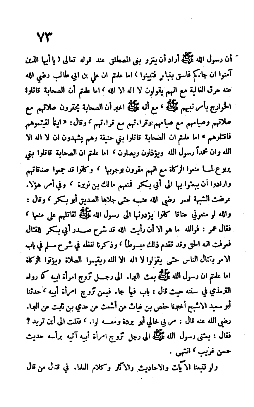 أن رسول الله –صلى الله عليه وسلم- أراد أن يغزو بني المصطلق عند قوله تعالى: {يَا أَيُّهَا الَّذِينَ آمَنُوا إِنْ جَاءَكُمْ فَاسِقٌ بِنَبَأٍ فَتَبَيَّنُوا} أما علمتم أن علي بن أبي طالب –رضي الله عنه- حرّق الغالية مع أنهم يقولون لا إله إلا الله، أما علمتم أن الصحابة قاتلوا الخوارج بأمر نبيهم –صلى الله عليه وسلم-، مع أنه –صلى الله عليه وسلم- أخبر أن الصحابة يحقرون صلاتهم مع صلاتهم وصيامهم مع صيامهم وقراءتهم مع قراءتهم، وقال: "أينما لقيتموهم فاقتلوهم" أما علمتم أن الصحابة قاتلوا بني حنيفة وهم يشهدون أن لا إله إلا الله وأن محمداً رسول الله ويؤذنون ويصلون، أما علمتم أن الصحابة قاتلوا بني يربوع لما منعوا الزكاة مع أنهم مقرون بوجوبها، وكانوا قد جمعوا صدقاتهم وأرادوا أن يبعثوا بها إلى أبي بكر فمنعهم مالك بن نويرة، وفي أمر هؤلاء عرضت الشبهة لعمر –رضي الله عنه- حتى جلاها الصديق أبو بكرن وقال والله لو منعوني عناقاً كانوا يؤدونها إلى رسول الله –صلى الله عليه وسلم- لقاتلهم على منعها، فقال عمر: فوالله ما هو إلا أن رأيت الله قد شرح صدر أبي بكر للقتال فعرفت أنه الحق وقد تقدم ذلك مبسوطاً، وذكرنا لفظه في شرح مسلم في باب الأمر بقتال الناس حتى يقولوا لا إله ويقيموا الصلاة ويؤتوا الزكاة. أما علمتم أن رسول الله –صلى الله عليه وسلم- بعث البراء إلى رجل تزوج امرأة أبيه، حدثنا أبو سعيد الأشج، أخبرنا حفص بن غياث عن أشعث عن عدي بن ثابت عن البراء –رضي الله عنه- قاتل: مر بي خالي أبو بردة ومعه لواء، فقلت إلى أين تريد؟ فقال: بعثني رسول الله –صلى الله عليه وسلم- إلى رجل تزوج امرأة أبيه آتيه برأسه حديث حسن غريب. انتهى.