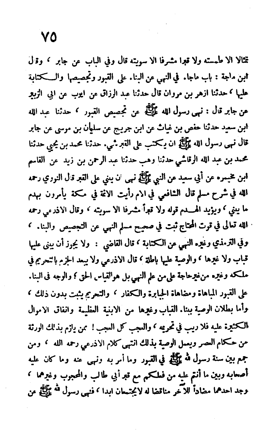تمثالاً إلا طمسته ولا قبراً مشرفاً إلا سويته قال وفي الباب عن جابر، وقال ابن ماجه: باب ما جاء في النهي عن البناء على القبور وتجصيصها والكتابة عليها، حدثنا أزهر بن مروان قال: حدثنا عبد الرزاق عن أيوب، عن أبي الزبير عن جابر قال: نهى رسول الله –صلى الله عليه وسلم- عن تجصيص القبور، حدثنا عبد الله بن سعيد، حدثنا حفص بن غياث عن ابن جريج عن سليمان بن موسى عن جابر، قال: نهى رسول الله –صلى الله عليه وسلم- أن يكتب على القبر شيء، حدثنا محمد بن يحيى، حدثنا محمد بن عبد الله الرقاشي، حدثنا وهب، حدثنا عبد الرحمن بن زيد، عن القاسم بان مخيمرة عن أبي سعيد عن النبي –صلى الله عليه وسلم- نهى أن يبنى على القبر. قال النووي –رحمه الله- في شرح مسلم قال الشافعي في الأم رأيت الأئمة في مكة يأمرون بهدم ما يبنى، ويؤيد الهدم قوله ولا قبراً مشرفاً إلا سويته، وقال الأذرعي –رحمه الله تعالى- في قوت المحتاج ثبت في صحيح مسلم النهي عن التجصيص والبناء، وفي الترمذي وغيره النهي عن الكتابة، قال القاضي: ولا يجوز أن يبنى عليها قباب ولا غيرها، والوصية عليها باطلة، قاله الأذرعي، ولا يبعد الجزم بالتحريم في ملكه وغيره من غير حاجة على من علم النهي بل هو القياس الحق؛ والوجه في البناء على القبور المباهاة ومضاهاة الجبابرة والكفار، والتحريم يثبت بدون ذلك، وأما بطلان الوصية ببناء القباب وغيرها من الأبنية العظيمة وإنفاق الأموال الكثيرة عليه فلا ريب في تحريمه، والعجب كل العجب! ممن يلزم بذلك الورثة من حكام العصر ويعمل الوصية بذلك. انتهى كلام الأذرعي –رحمه الله-، ومن جمع بين سنة رسول الله –صلى الله عليه وسلم- في القبور وما أمر به ونهى عنه وما كان عليه أصحابه وبين ما أنتم عليه من فعلكم مع قبر أبي طالب والمحجوب وغيرهما، وجد أحدهما مضاداً للآخر مناقضاً له لا يجتمعان أبداً، فنهى رسول الله –صلى الله عليه وسلم- عن